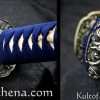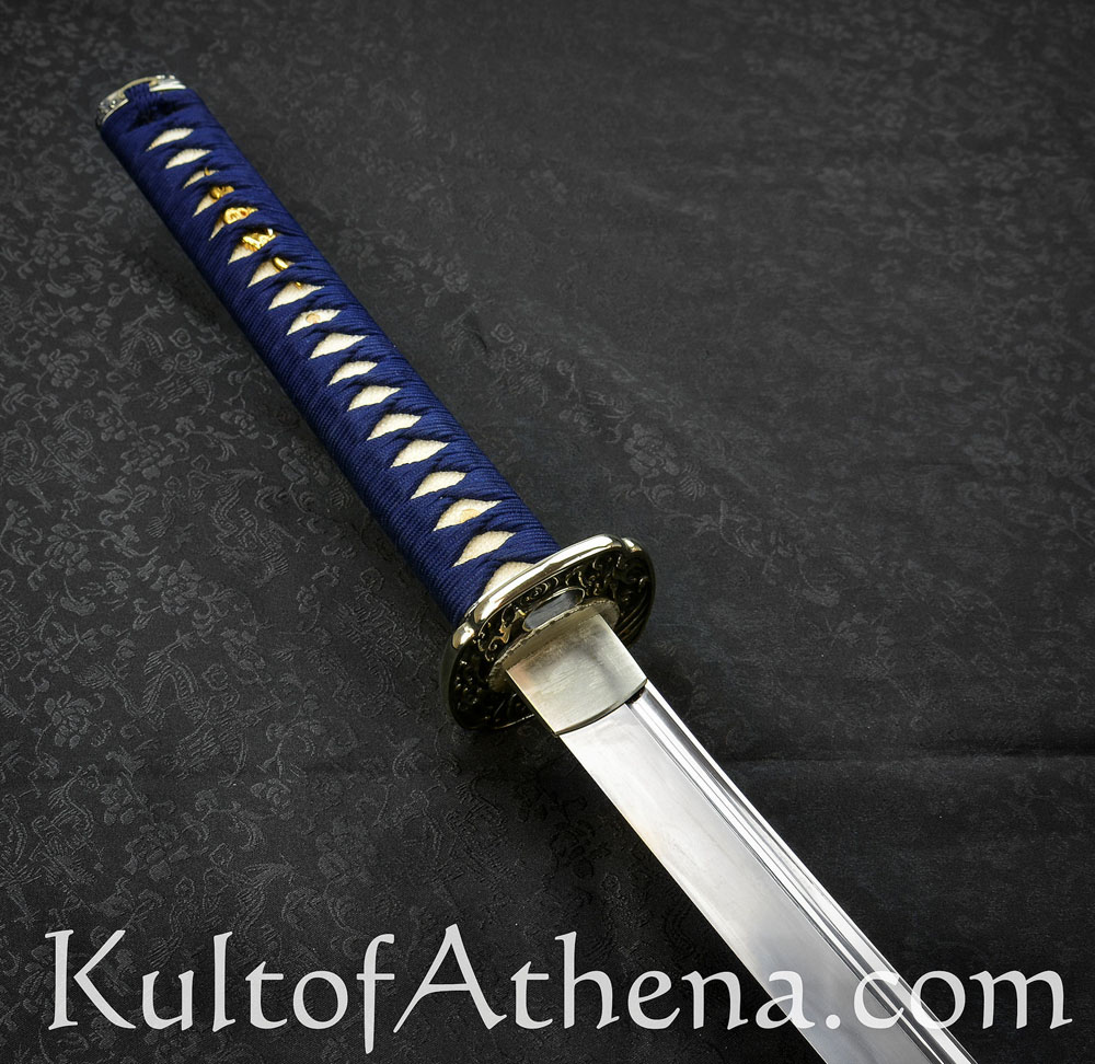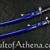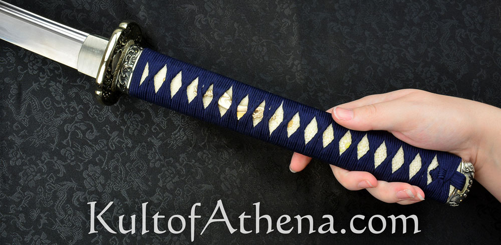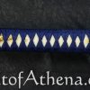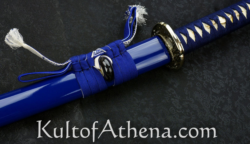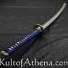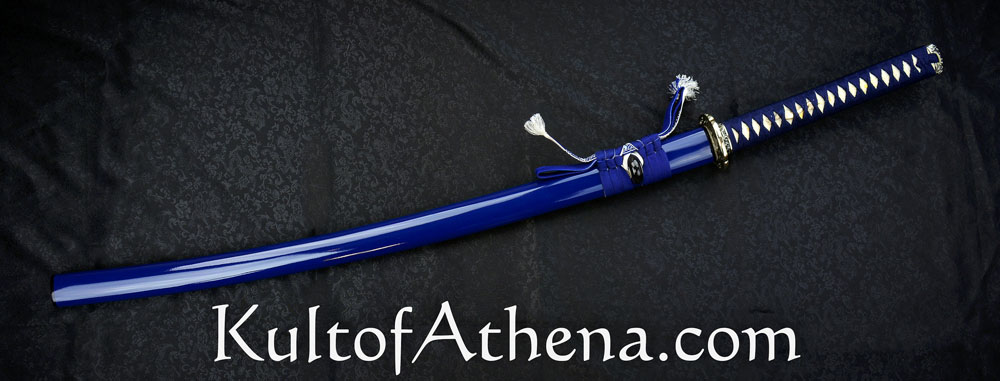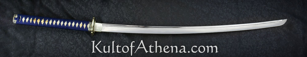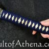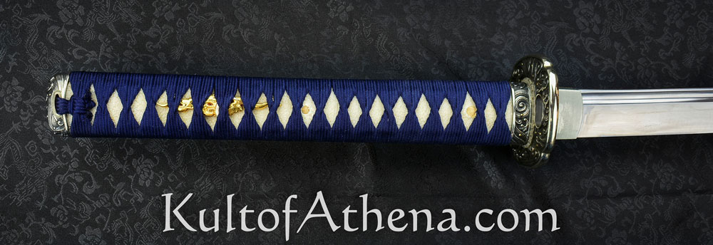 Gregor 44 I wanted this blade for years but $1,399.00 MSRP at Hanwei was not the great lower price at Kult of Athena. The deep blue saya matches the ito and sageo really well. The deep sea wave theme continues with the crisp and well-defined fittings as they grab your eye and help you grip the sword. Folded T10 and 9260 steel give the blade a swift and balanced feel as I drew and cut my targets. I think this is best for more experienced swordsmen since it may be less forgiving if your technique is still being perfected. I watched a poor review done by an amateur swordsman in the forest swinging the blade like a baseball bat or axe as both of his feet flew off the ground. He kept doing wild swings and cuts not paying attention to his technique or stance and more interested in showing off for YouTube. That review was not accurate since this is a really well-made blade that is a gorgeous and functional work of art made for serious sword practitioners and collectors.