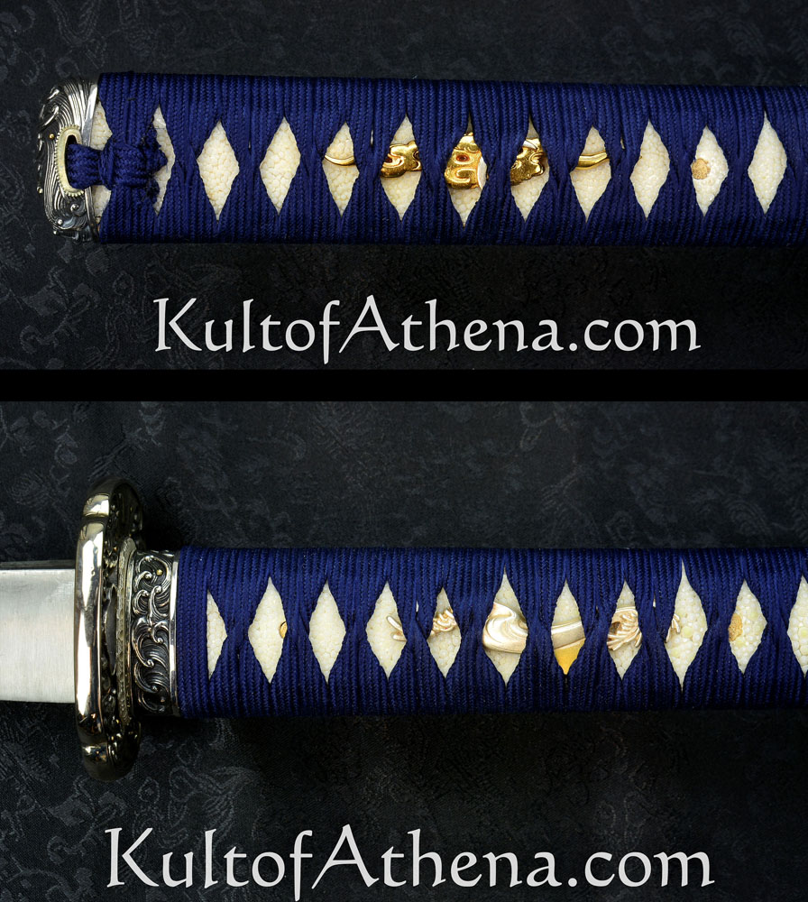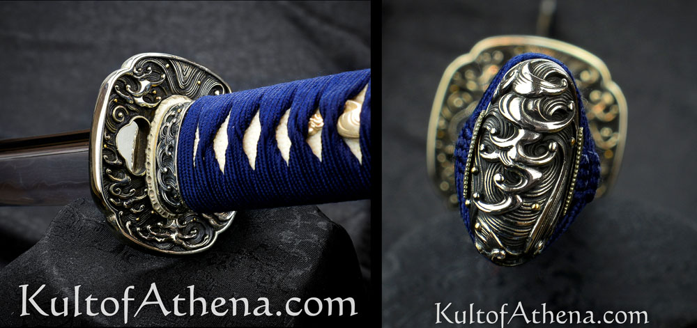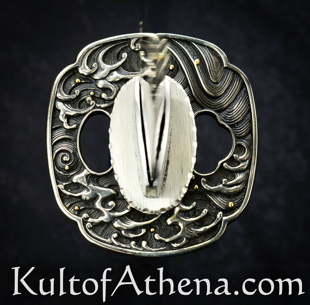 The tsuba, fuchi and kashira are supremely detailed and full of deeply embossed imagery and it is in the eye of the beholder as to whether the depict the gently swirling waters of a wave-kissed lagoon or a roiling tsunami. These silvered components are matched with a silvered habaki and seppa. The hardwood grip is inlaid with genuine rayskin and tightly bound in tsuka ito cord. Gold and silvered menuki wave menuki are fitted beneath these tight folds.
