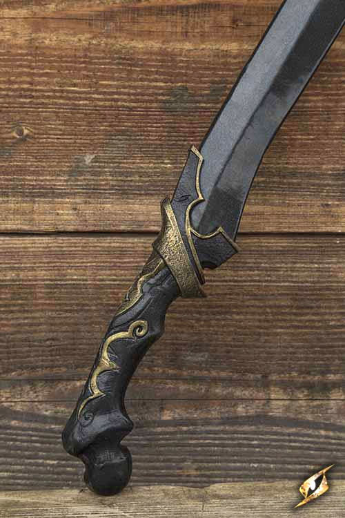 Epic Armourys Dark Elven Shadow Blade is a latex-hybrid chopping medium sword for the cruel Dark Elf or roguish villain. The sword is 85 cm long from tip to pommel, with a curved single-edged blade. The detailed crossguard features gold accents and a sculpted grip, allowing optimal maneuverability and comfort for the hand. The handle is cast and painted to look like a blackened bone, while the elegant and deadly blade is painted a metallic black.