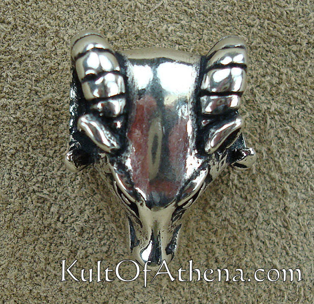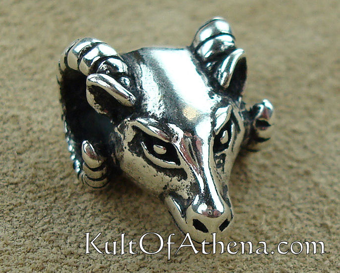 This silver pendant is in the form of a Ram’s Head and includes a leather neck thong.
