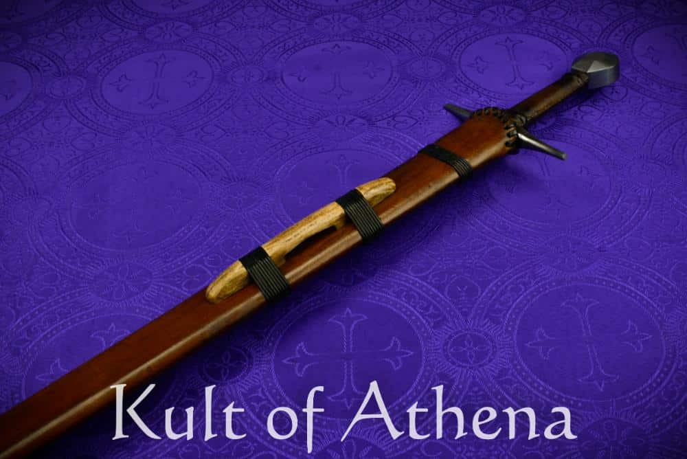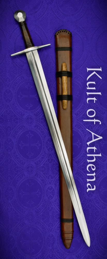 The new version of the Sir Marshal Sword has a more pronounced distal taper to lighten and better balance the blade and also a better fitting scabbard with improved design. A good example of the knightly sword of the high middle ages, the tempered blade is crafted from C60 (similar to 1060) high carbon steel with a hardness of 48-52 HRc. The hilt components are forged from steel and the grip is wood with a leather stitched binding which is tightly fitted. The scabbard is crafted from wood and bound in matching leather It has binding cord of leather and a wood suspension loop for a belt or baldric.