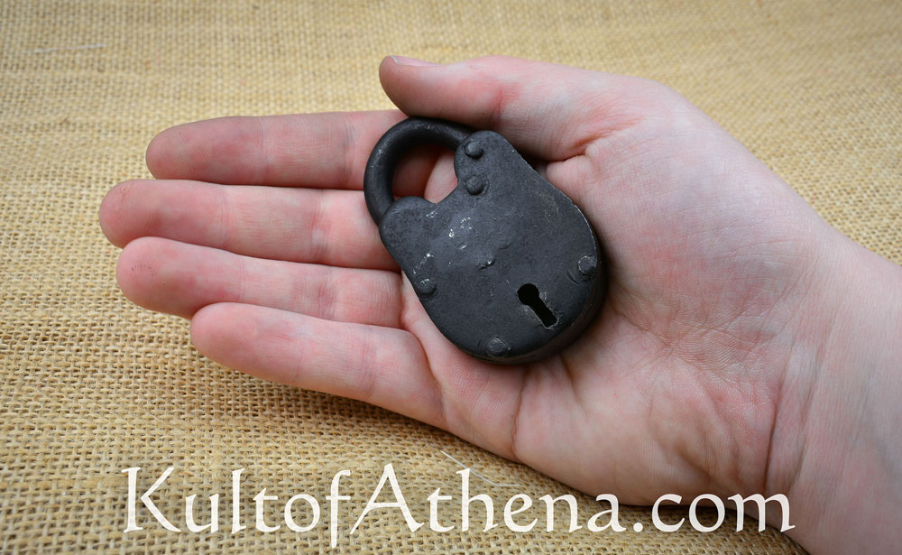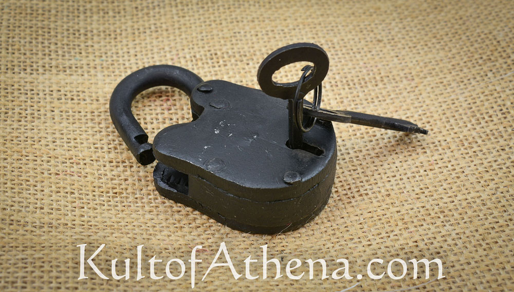 This small padlock is crafted from iron; fully fuctional, it can be locked and unlocked with its included set of iron keys.