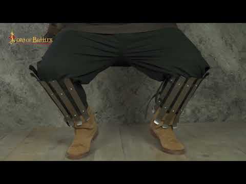 This pair of splinted greaves are composed of 16 gauge steel bands riveted to a backing of sturdy leather straps. These backing straps are fitted with a steel buckle which allows them to be adjusted to fit around the shin.