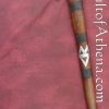 This pipe tomahawk has an unsharpened head of high carbon steel. The shaft is of wood and is decorated with cross-hatched banding and riveted metal inlay. A hole is drilled through the shaft and into the pipe bowl, allowing for the use of the tomahawk as a peace pipe.