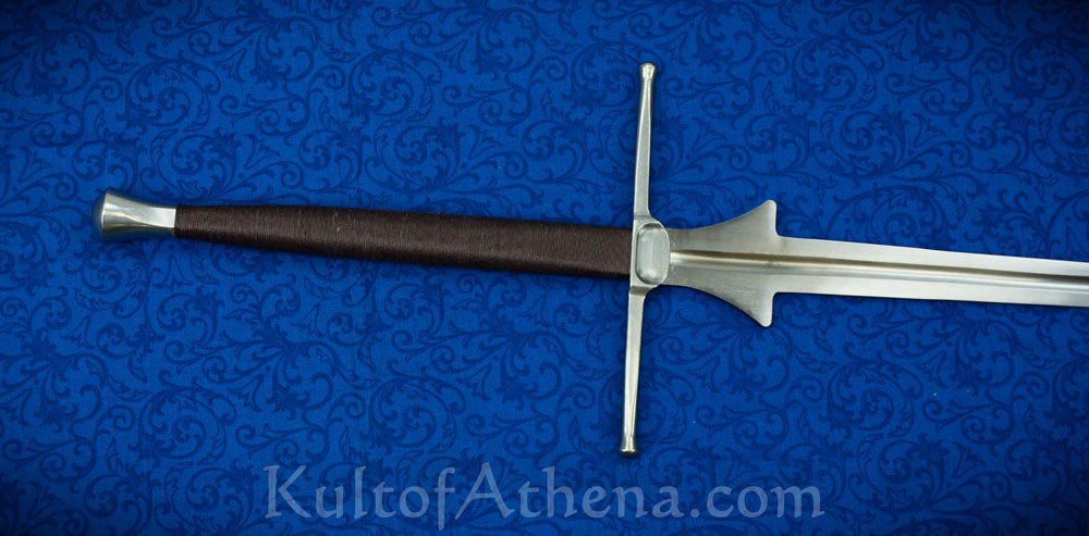 The crossguard and pommel are steel and featured is a ramped thumb indentation on both sides to facilitate an ease of guard transitions with a gloved hand. The pommel is squared at its base to aid with edge alignment for the rearmost hand.