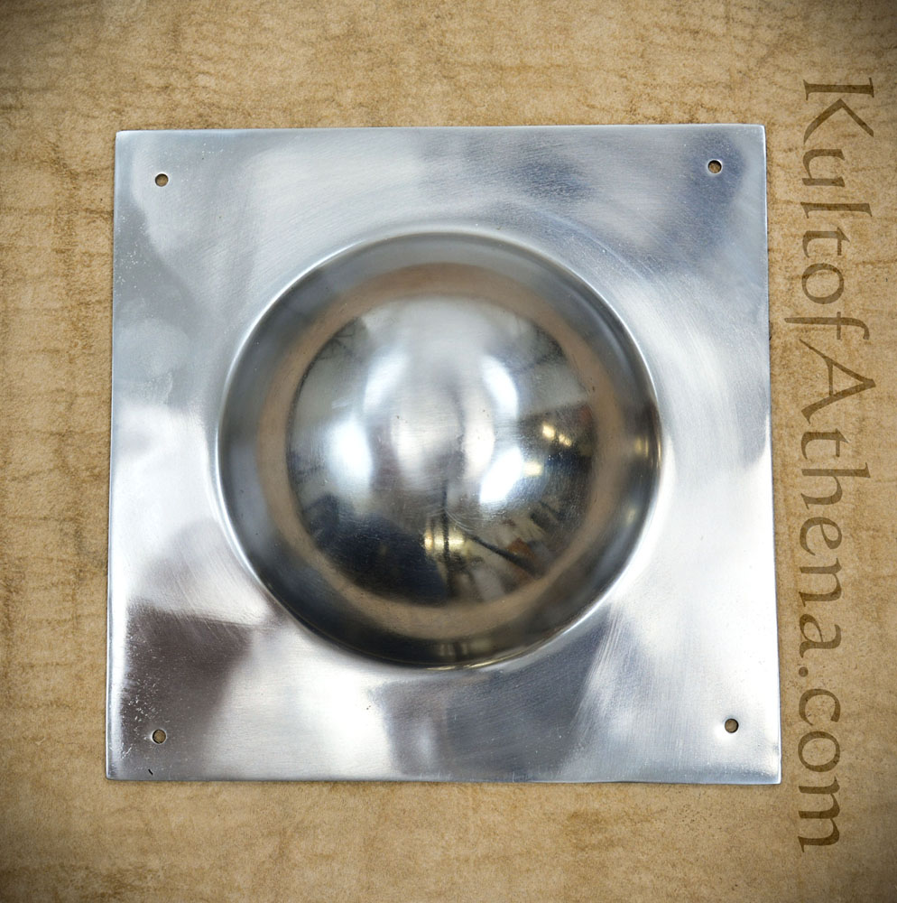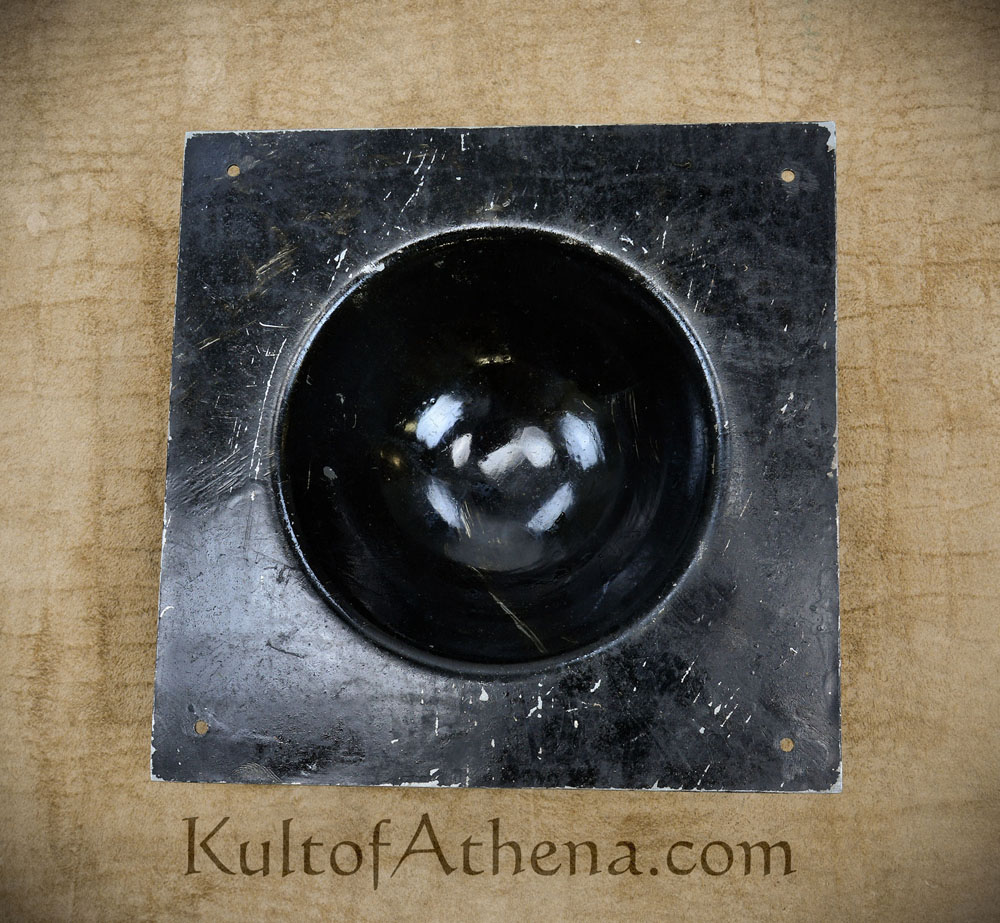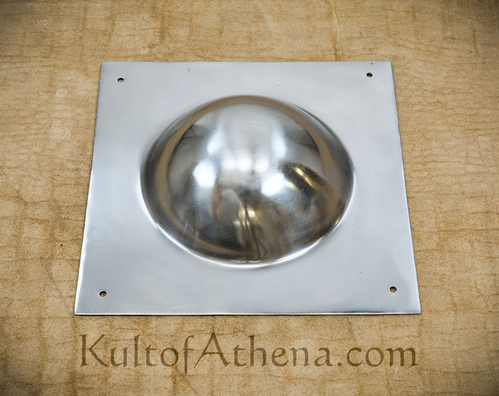 16 ga steel boss very heavy, nicely made. you will need an anvil and a big hammer to try to bend this to fit a curved shield, even then you cant curve the area that the bowl encompasses.