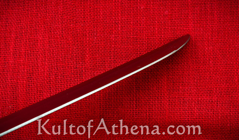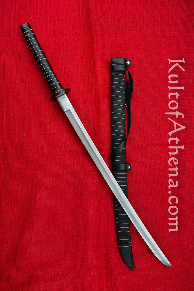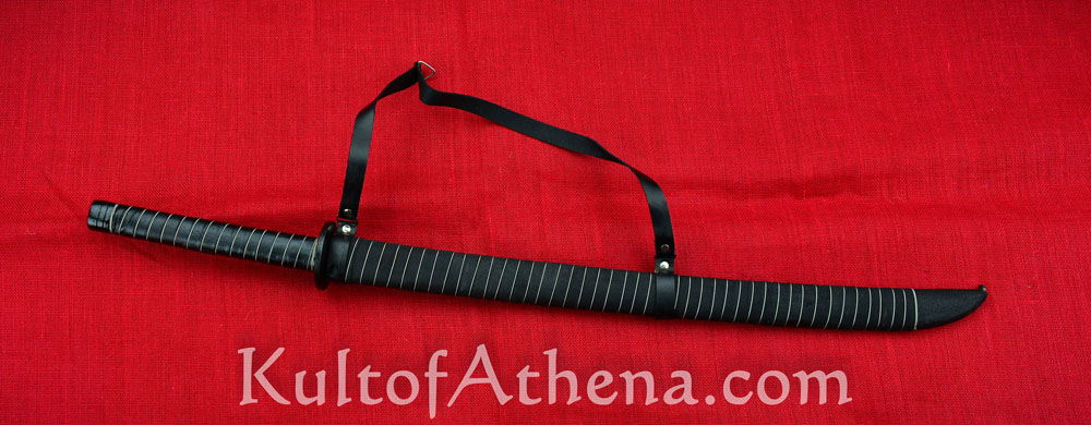 A durable full tang weapon of rigid steel featuring a blunt edge for Live Action! The grip is padded with leather and wire wrapped with blackened iron tsuba and end cap. This full tang battle ready weapons has been crafted by hand with the blade made from a single thick rigid piece of steel that extends the length of the blade through grip with heavy welded guards and pommels. Durable and suitable for stage battle and reenactment fighting. Includes a matching scabbard.
