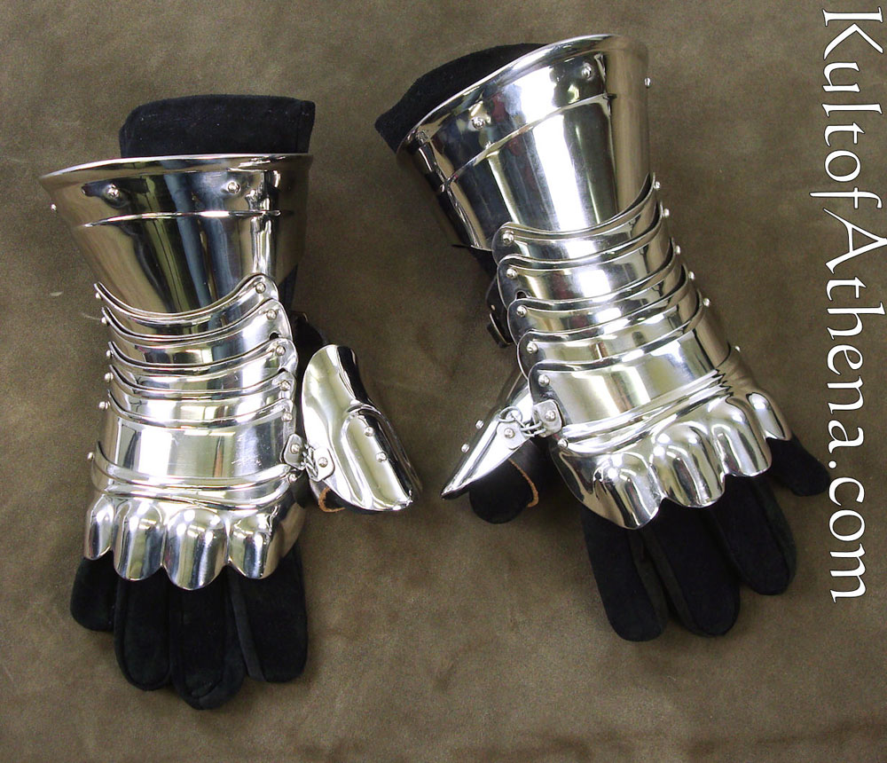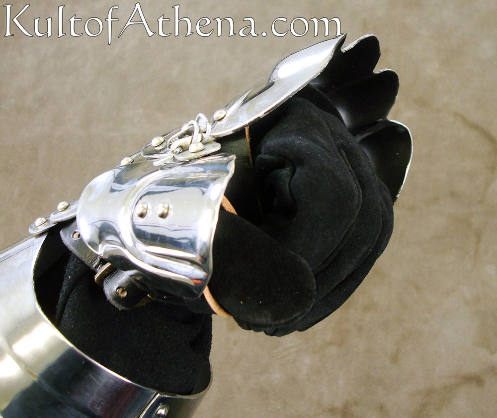 Crafted from 18 gauge stainless steel, these articulated gauntlets protect most of the hand, whilst leaving half the fingers free so as not to interfere with the handling of your weapon. A compromise between protection and the dexterity of the hand.