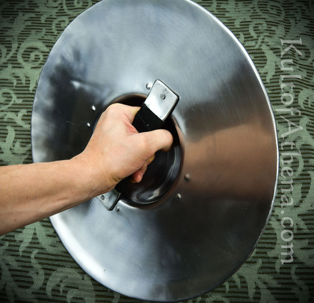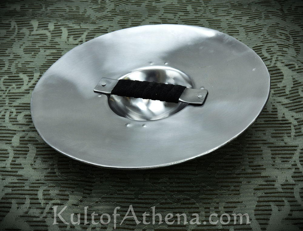 This buckler is stoutly crafted from 14 gauge steel; the reverse of the shield has a steel bar grip that is riveted into position and completed with a suede leather grip wrap.
