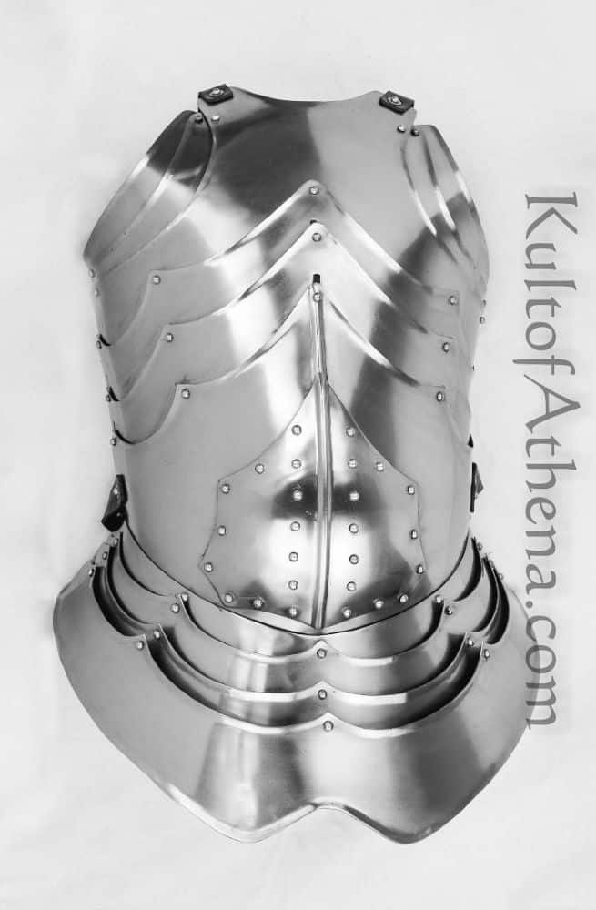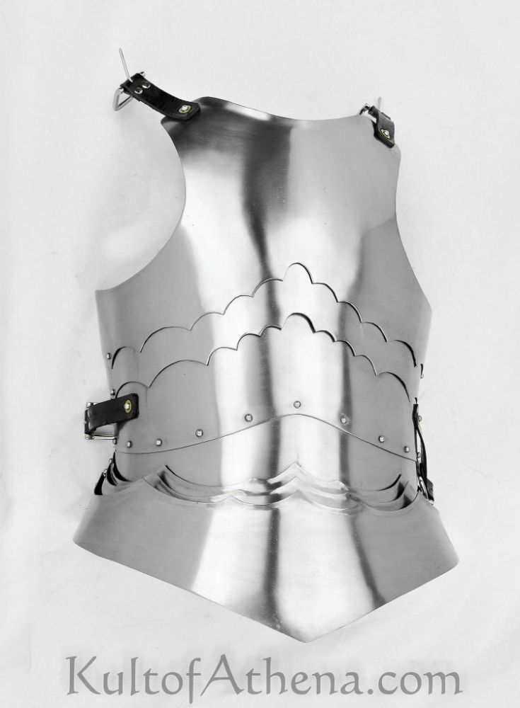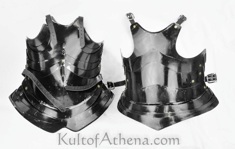 This Medieval Knight’s Cuirass is crafted from 18 gauge steel; the steel plates for the breastplate are skillfully crafted with a set of center and side sliding rivets that allow for the individual segmented plates to glide past one another to expand or contract to enhanced torso movement. The backplate features some of this slide-rivet construction for its crucial areas and swivel rivet for the rest of the plates. The segmented fauld plates are likewise constructed with swivel rivets for mobility. The armor is donned and adjusted with a set of thick black leather straps matched with large stainless steel buckles on the shoulders and sides.