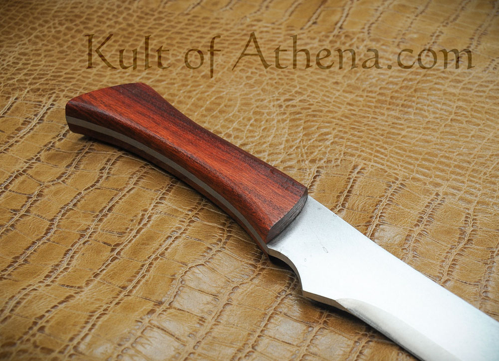 Handmade by Scorpion Swords and Knives comes this unlicensed replica of Aragorns Strider ranger knife from Peter Jacksons The Lord of the Rings. This functional blade is made from thick 1095 carbon steel. The integrated blade tang is sandwiched between a wooden grip. The fighting knife comes with a stictched leather sheath with a belt loop.
