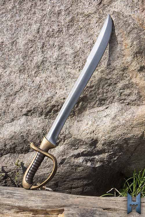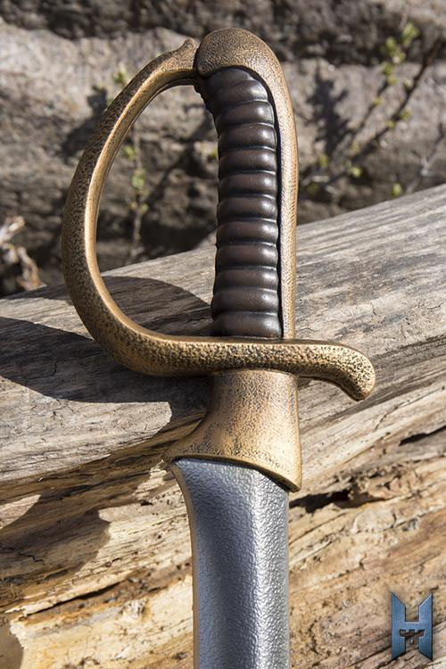 Strongholds Cavalier Sword is a medium sword inspired by the cavaliers of the 1600s, imitating their reckless attitudes and rich sense of style. The sword is 76 cm long and has a 51 cm single-edged blade that gets wider toward the end. The handle has impressive detail, including a crossguard that curves around the hand, connecting to the pommel. The handle is handpainted to looks like faded bronze. The 14 cm grip is cast and painted to look like ribbed leather, ergonomically shaped to fit the hand.