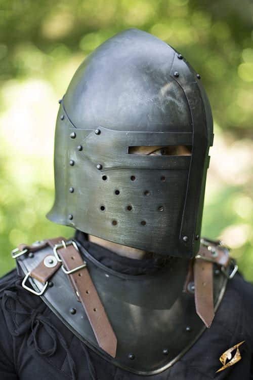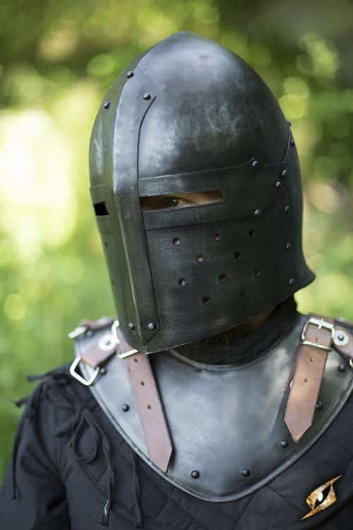 Great Helm! (pun intended) I didn’t buy this here, but I do own this helm. I love it! Vision and breathing are excellent, and the weight is easy to manage. It’s very comfortable when the padding is adjusted to your liking. It’s large enough that you can easily wear a padded coif and a mail coif under it. I can even wear glasses with it on! :) On mine, I took a scuff pad to it and removed some of the darkening….looks like it should be in a museum case. Very, very nice helm for the money!
