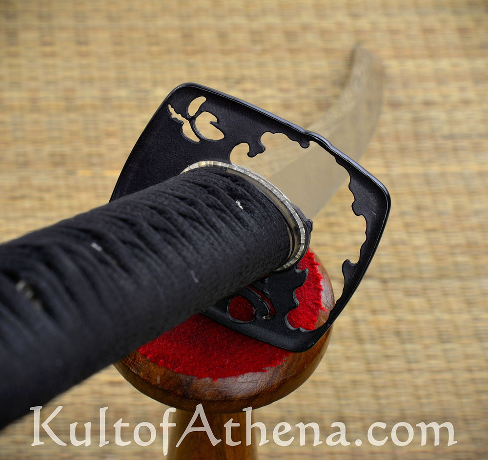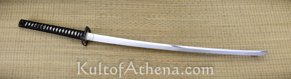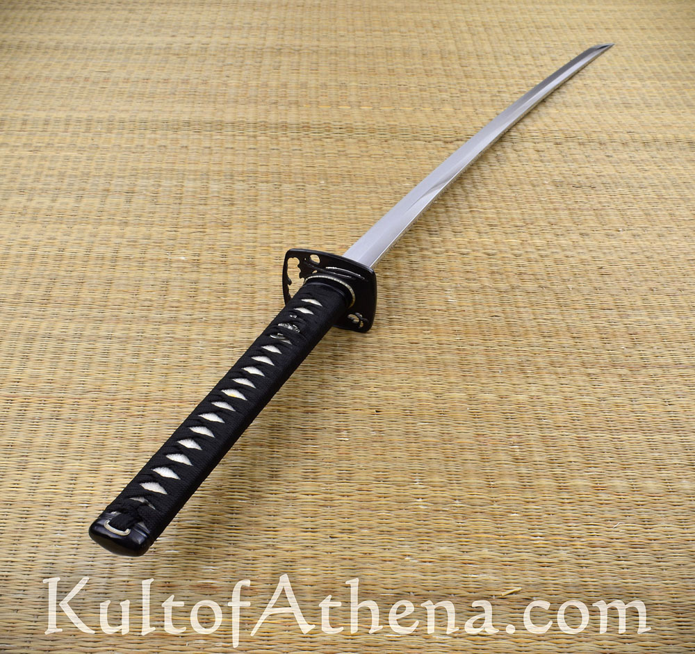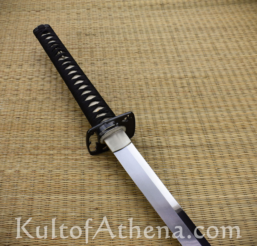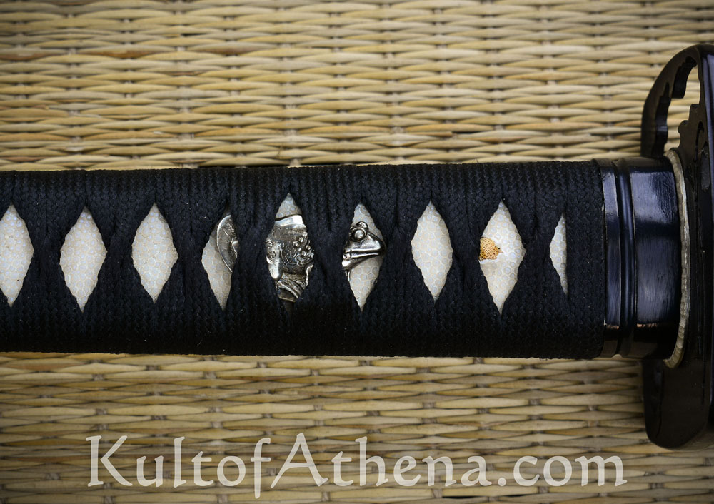 The sharp blade is tough, tempered and dependable 5160 high carbon steel which is well suited to rigorous citting practice; the habaki and seppa are silver and the tsuba is blackened stainless steel which is matched with metal fuchi and kashira hilt fittings which are also blackened. The carved wood tsuka grip is inlaid with panels of genuine rayskin which is bound within tight cords of black ito.