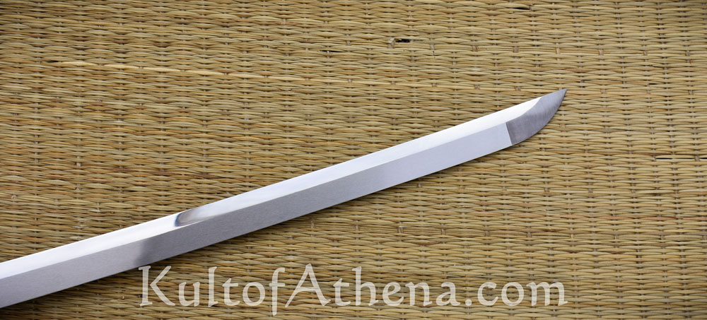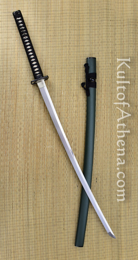 The sword comes with a companion saya scabbard carved to fit from wood and finished in textured green lacquer and a black sageo cord. Also included is a cloth sword bag.