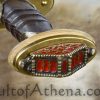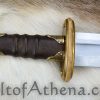 The pommel cap is cast a bit sloppily, especially compared to the original find. The red enamel is bit more red-orange and while the original has subtle differences in the latticework pattern on either side, it is symmetrical on this version. For the price, though, I certainly was not expecting a sword fit for a king. My only other issue was that for a while the sword was not able to fit fully into the sheath. My guess is that a piece of the leather lining the interior was sticking out. However after quite a bit of sheathing and unsheathing with a decent amount of force, it seems to have become less of an issue.
