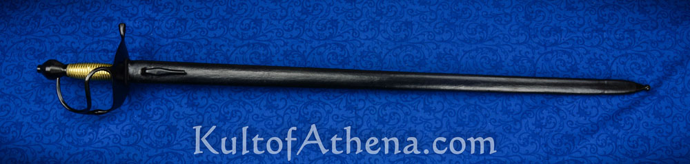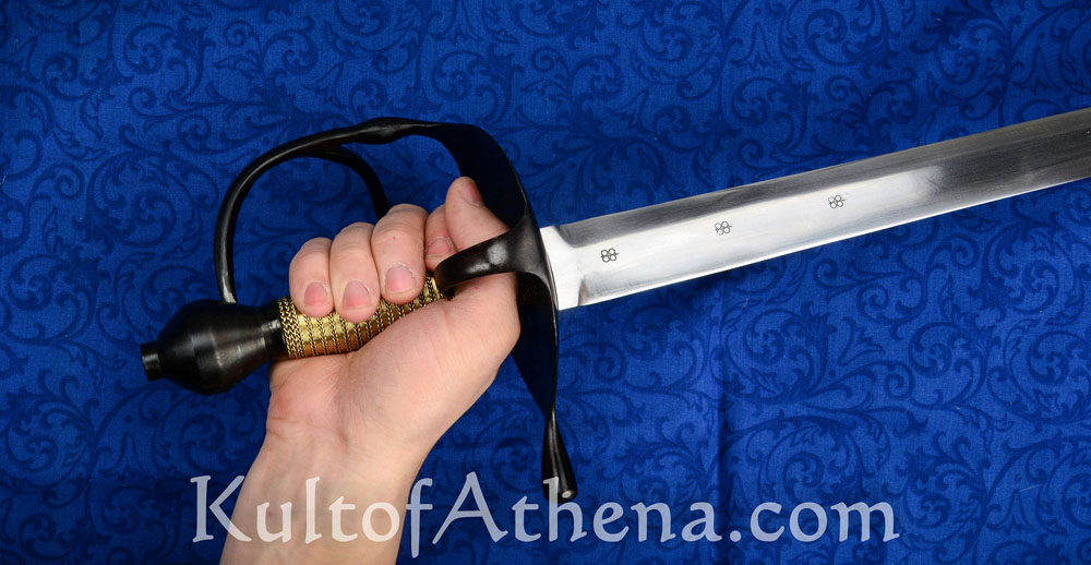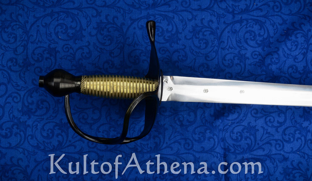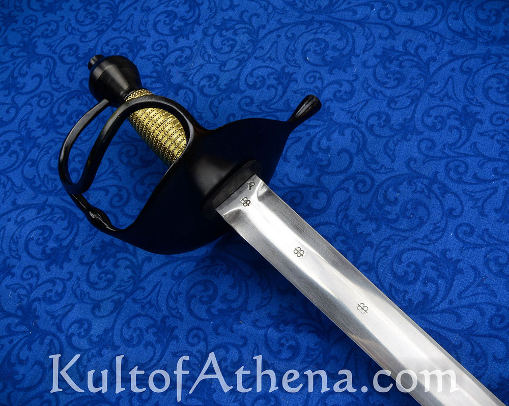 One of the earliest mass-produced weapons, the Swedish M1685 was a standardized sword with over 300,000 produced. The blades were of a cut-and-thrust design and the hilts were typically iron and painted black as proof against rust. An oval-disc guard coupled with a two-bar knucklebar give good protection for the hand and an integrated thumb ring gives the sword better handling characteristics and better point control. Produced from 1685-1737, these swords were in use for over a hundred years. In 1832 many of these swords were cut-down and re-purposed as hangers for naval use.