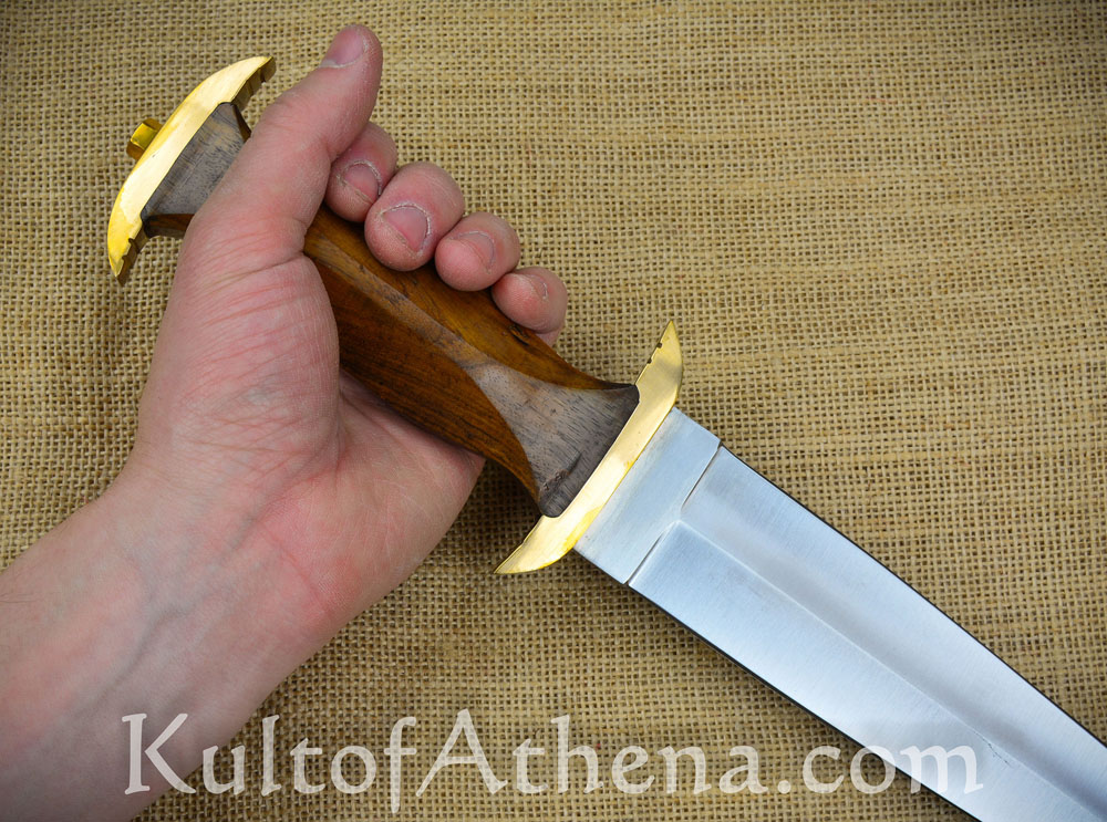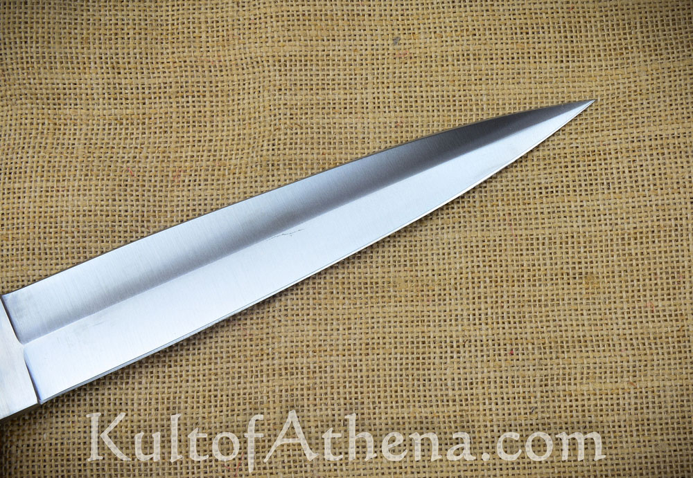 The Swiss Holbein Dagger was a popular in late medieval / Renaissance Switzerland and Southern Germany. A more stylized descendent of the Baselard, this attractive yet popular dagger was a common sidearm for the famed Swiss Mercenaries. The elongated guard and pommel serve to couch the hand in place and keep the dagger from sliding through the hand upon contact with a target to ensure the delivery of maximum penetrative force. This example has a robust grip which is well-suited to larger hands.