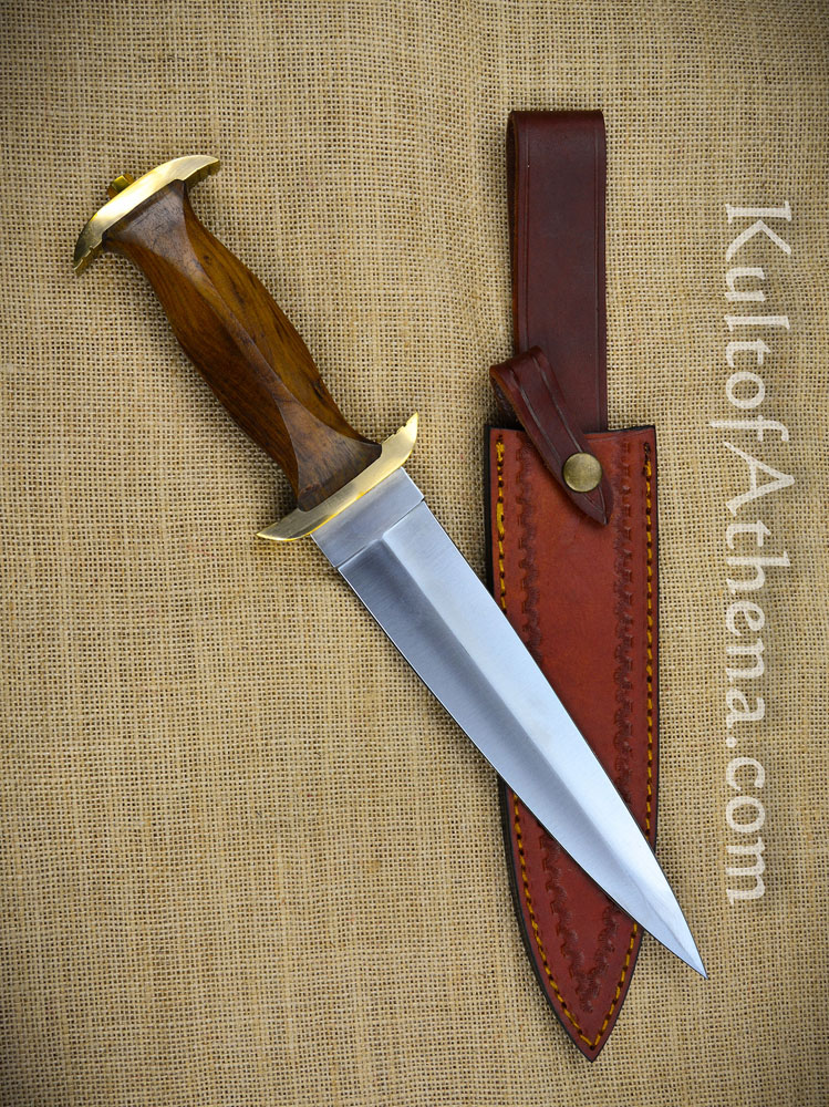 The blade of this Swiss Holbein dagger is stainless steel; the guard and pommel cap are brass and the grip is carved wood. Included with the dagger is a sheath of durable leather with stitched construction. It has an integrated belt loop and buttoned retaining strap.