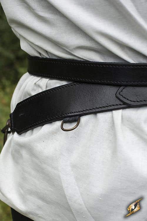 This sword belt is composed of two linked belts of leather with antiqued brass hardware and is worn by wrapping it around the waist twice and includes a large antiqued brass ring for your sword or weapon, as well as other rings to accommodate other weapons or equipment. The belt leather is backed by softer material for comfort.