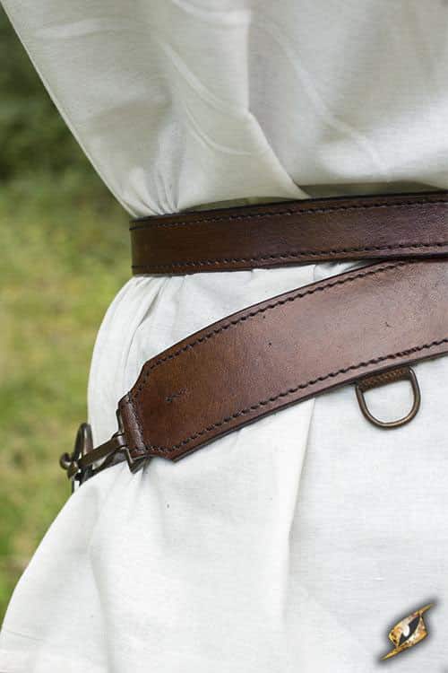 This sword belt is composed of two linked belts of leather with antiqued brass hardware and is worn by wrapping it around the waist twice and includes a large antiqued brass ring for your sword or weapon, as well as other rings to accommodate other weapons or equipment. The belt leather is backed by softer material for comfort.