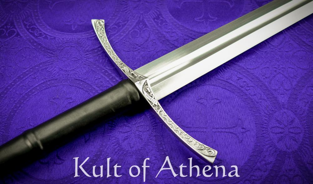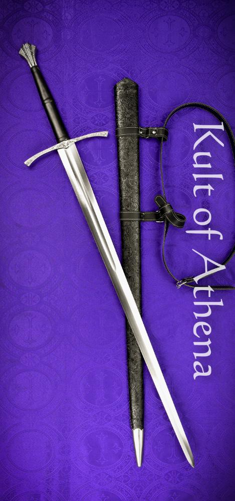 The sword’s design is both practical and visually striking. Inspired by Oakeshott Typology XVIa, a form popular in the late 14th and 15th centuries, it balances thrusting capability with cutting potential. The 35-inch spring steel blade tapers from approximately 5.7 mm at the base to 2.1 mm near the tip, delivering a harmonious mix of agility and authority. Weighing just over 3 lbs with a point of balance around 3.5 inches from the guard, the sword feels lively in the hand while retaining the mass needed for strong, decisive strikes. The nearly 9-inch leather-wrapped grip accommodates two-handed handling, offering leverage for powerful cuts and control for precise thrusts.