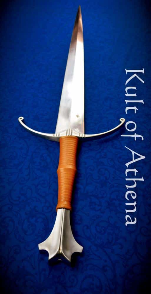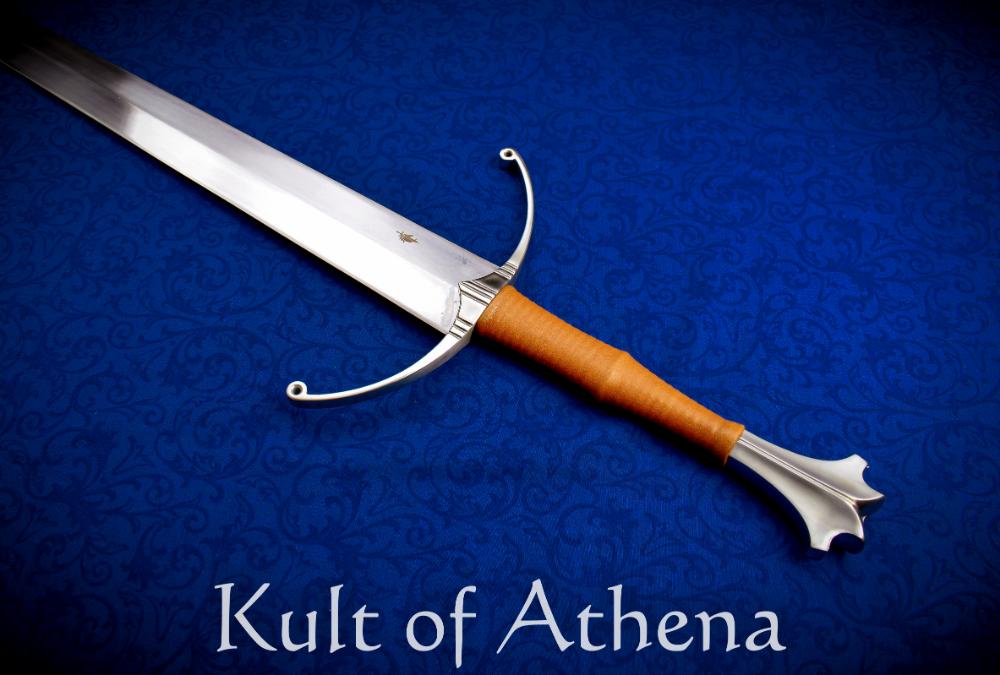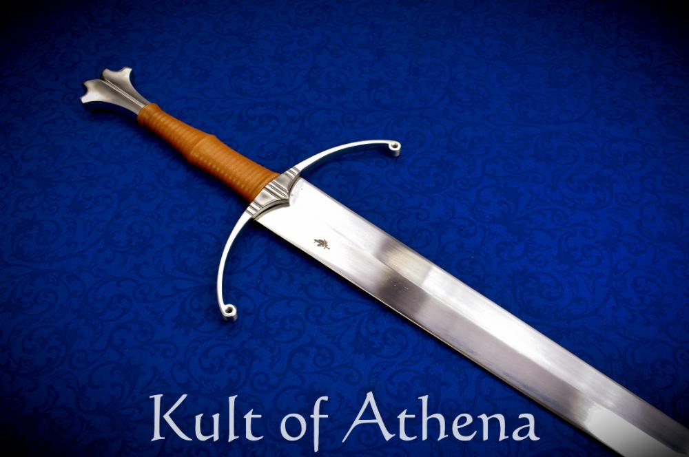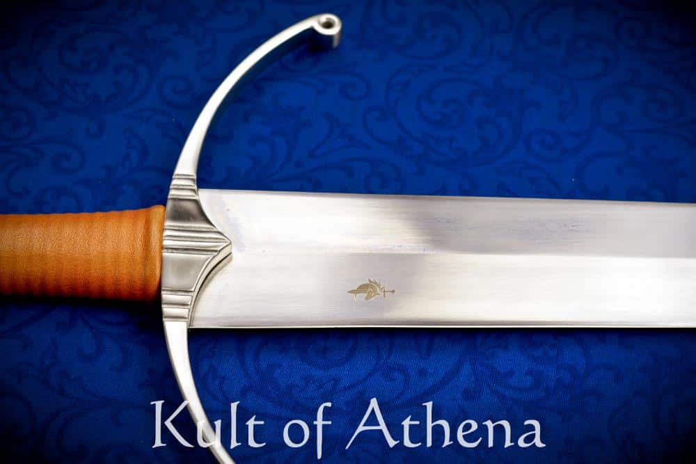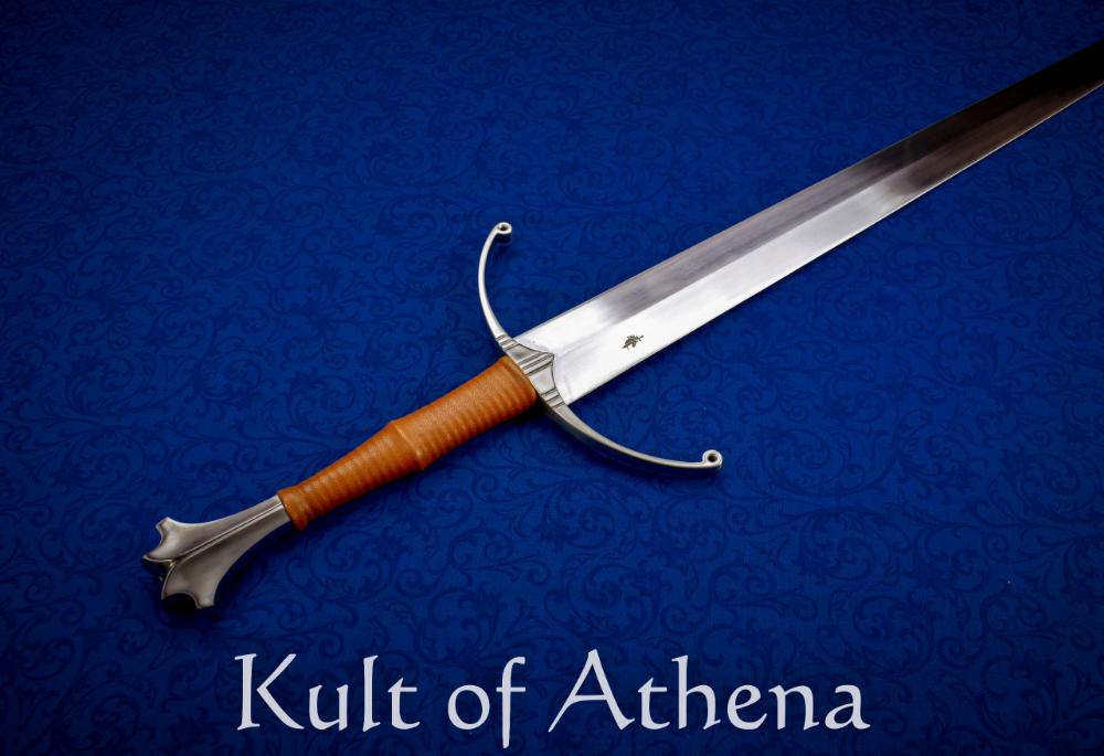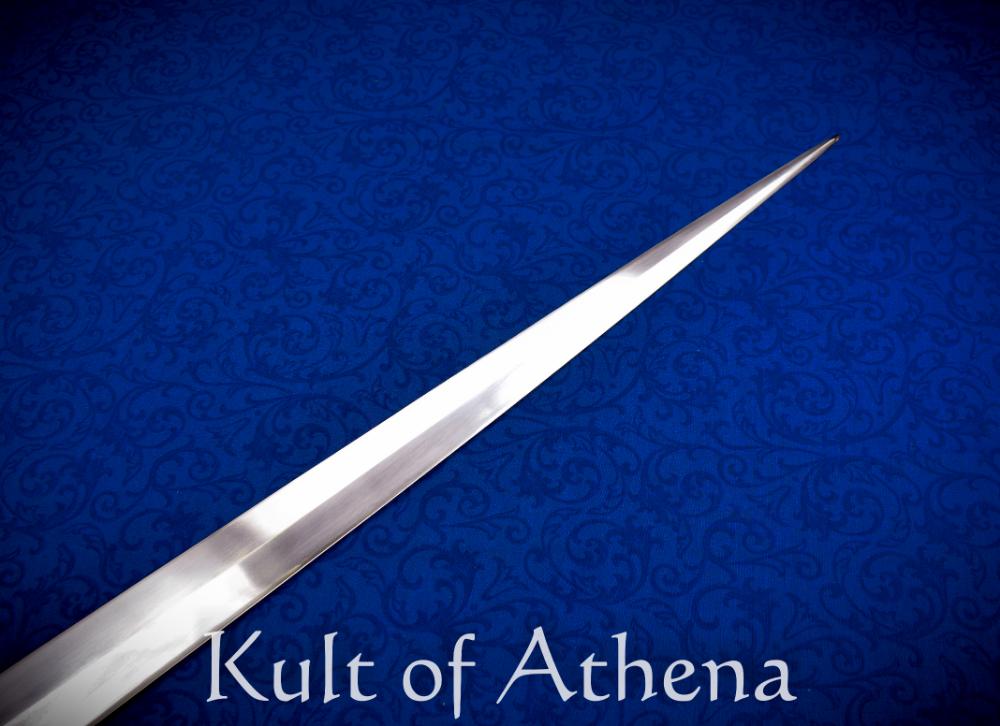 Though practical, the lines of this sword are elegant and purposeful. Inspired by Oakeshott Typology XVa (a form common in the 14th–15th century) this design balances thrusting capability with cutting potential. Its 33 inch spring-steel blade tapers from 5.4 mm at the base down to 2.8 mm near the tip, delivering a refined balance of agility and power. Weighing a bit more than 3 lbs and with a point of balance approximately 4.5 inches from the guard, the sword feels lively in the hands without sacrificing the authority of a substantial blade. The 6 inch leather wrapped grip gives generous space for two-handed handling, allowing for strong leverage in powerful cuts or controlled precision in thrusts.