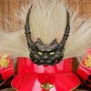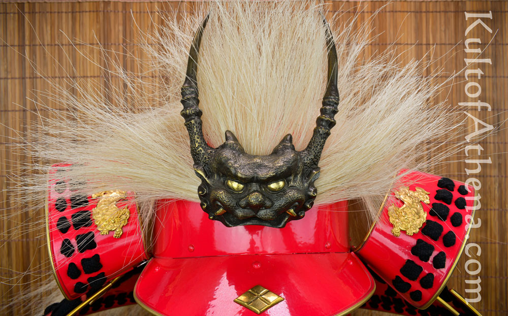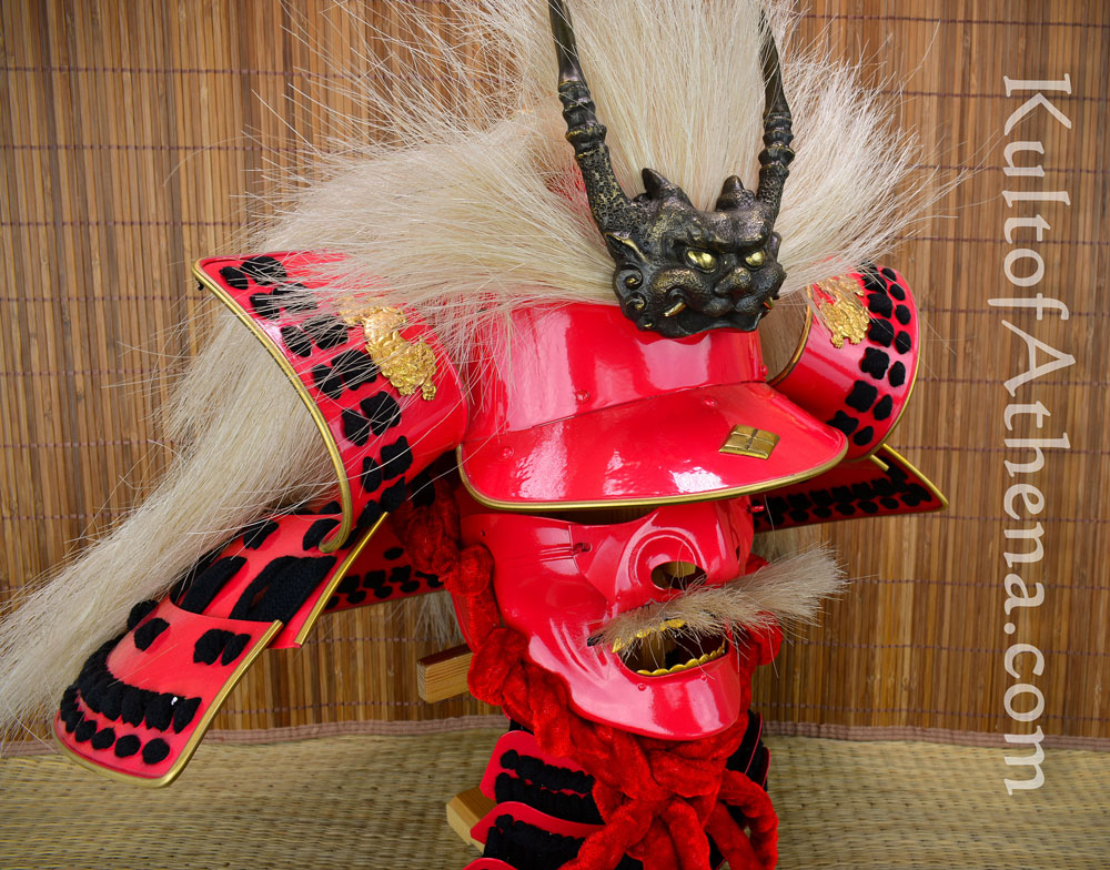The armor plates are articulated with the traditional construction of black cotton cordage. The horned Oni Demon is made from weighty, solid brass with an antiqued brass finish with detailing picked out in polished, gleaming brass – it can be removed if desired. The Mempo face mask guard is also removable and is attached to the helmet by knotting it into position with the thick helmet cords. A genuine horsehair moustache and plume complete the helmet.