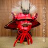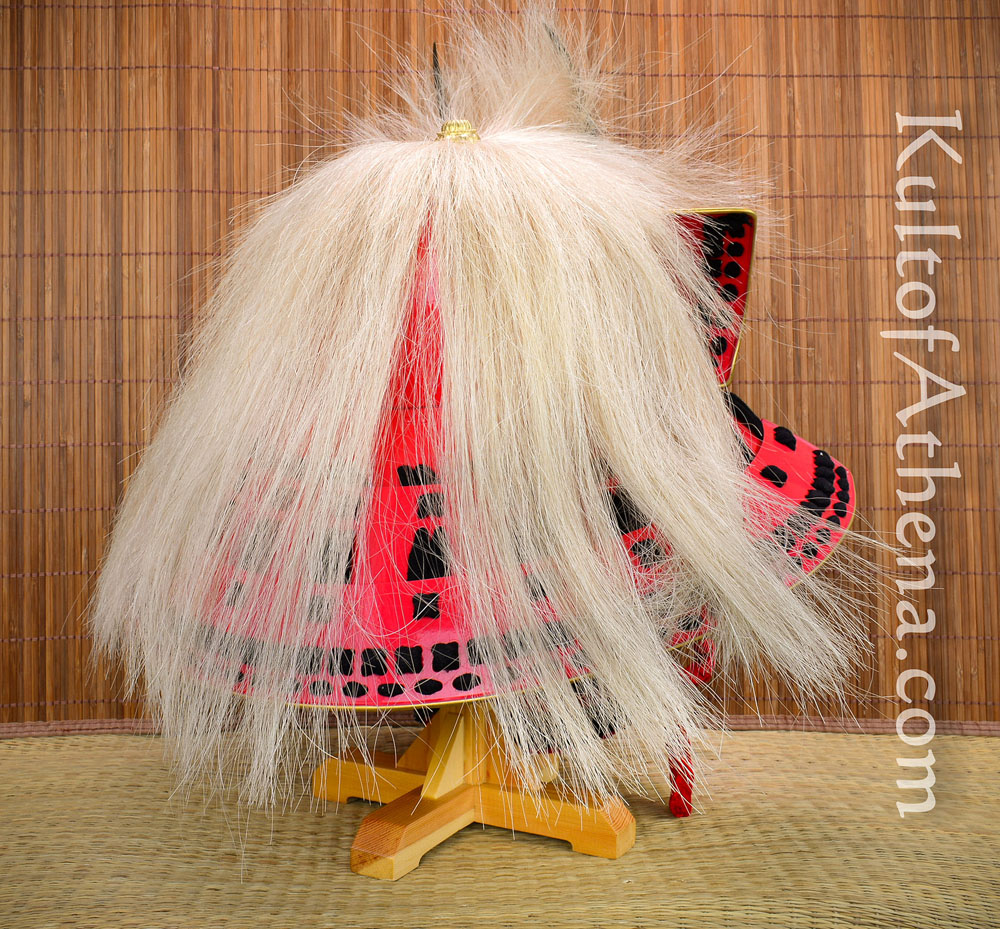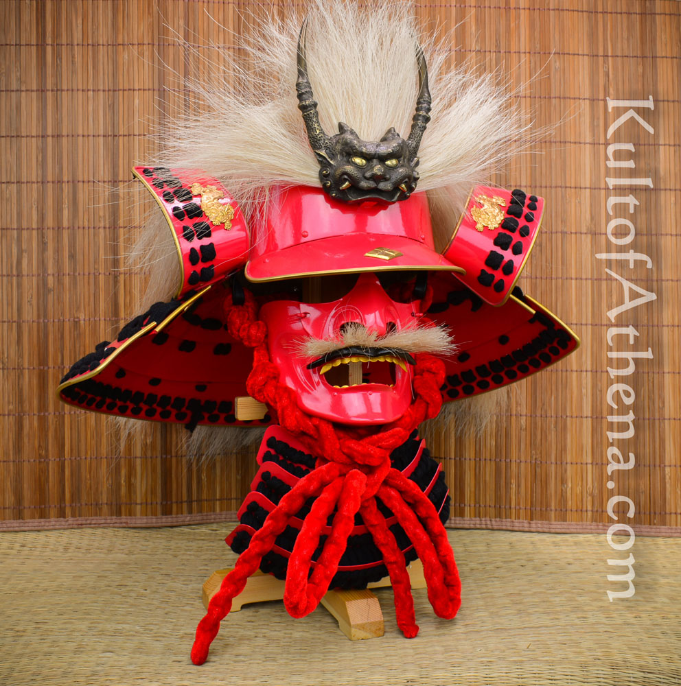 This recreation of the helmet of famed Daimyo Takeda Shingen is rich in sumptuous detailing and serves as a magnanimous and commanding centerpiece to a collection Japanese swords and curios. The helmet is lined and fully wearable as well and is crafted from 18 gauge steel and finished with a glossy red lacquer and embellished with gold plated detailing and edging.
