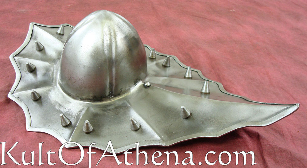 Assault buckler! This little beauty is slightly large and heavy for a buckler but it is really more of a small shield/secondary weapon than a true buckler. Sure, sure, it can parry, block and deflect just like a normal buckler but it is also purpose built to hack and stab and bash with. The pointed ridges along the top would make for a nasty surprise if they were caught in the neck, face, or unprotected chest. The highly tapered bottom point can also be used as a brutal attention getter/head cracker. The huge boss and rows of spikes along the front make for quite effective body blows. I find the handle to be a bit thin so I suggest wrapping it yourself for a good grip that wont twist in the hand. I find it also quite beautiful. It’s design is based on a rose motif. The boss is the bud, surrounded by thorns and sitting on a jagged rose leaf. The spikes come blunted (but are still heavy bruisers) and I wish that the boss came to a sharp point like in the manuscripts but I’m very happy with it overall.
