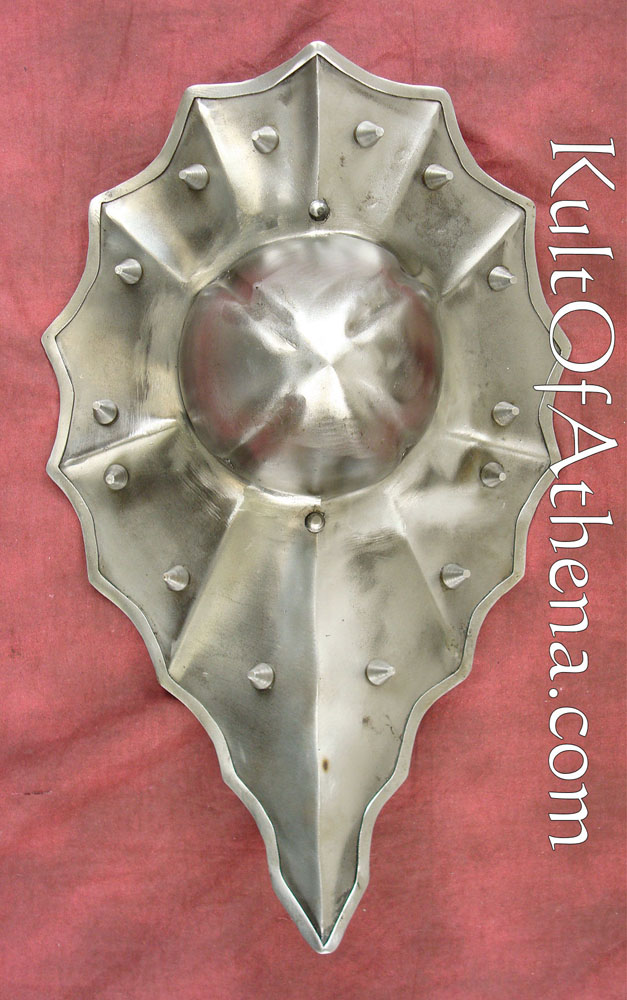 Good for the price The first thing I noticed about this is how uncomfortable it is to hold without gloves on and I think it’s just due to the shape and size of the handle. It’s a bit heavy but really not too bad. The shape of it is very nice looking although I’m not sure what the spikes would be used for. When I tested it nothing I shot it or stabbed it with got through. Arrows from my 50 pound bow deflected off leaving a couple scratches and when I stabbed it with a sword it went into the shield a little bit leaving a small but noticeable hole. Overall though it’s pretty decent for the price.