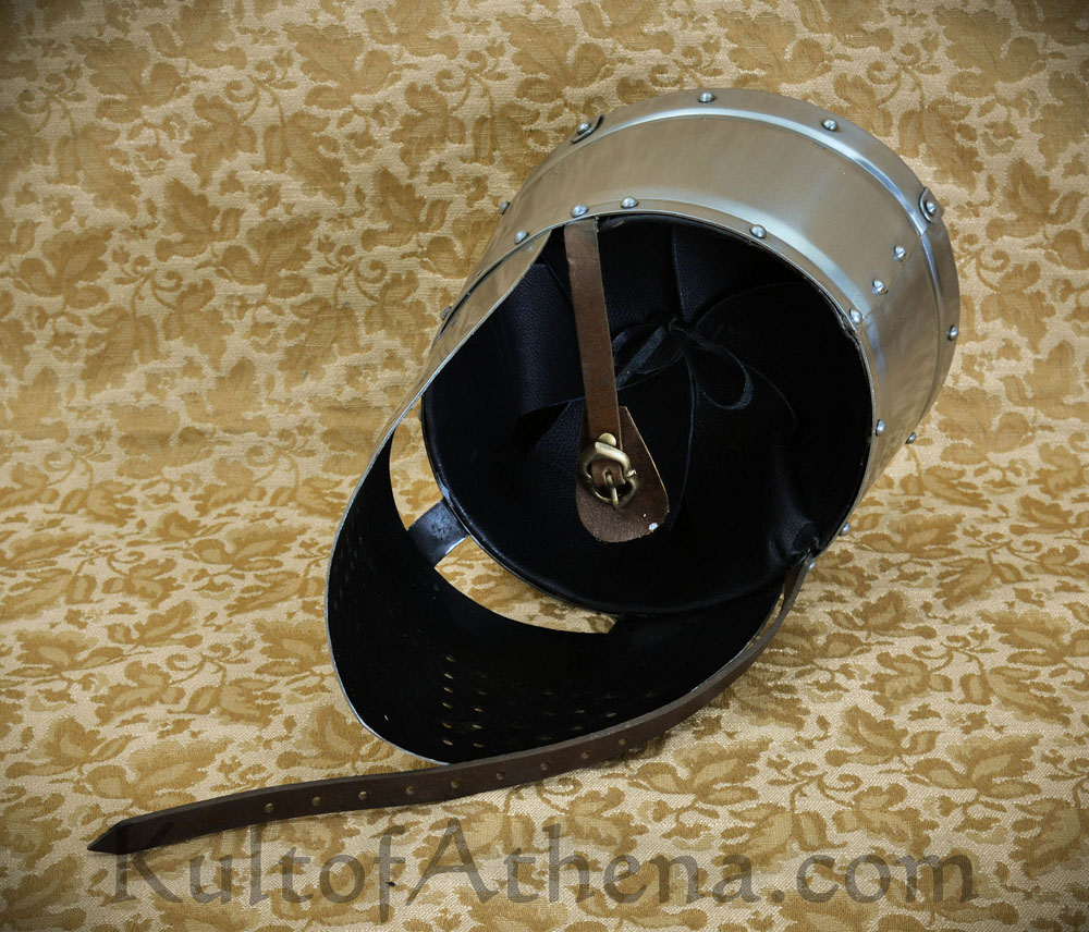 This Templar Pot Helm with Faceplate is crafted from riveted plates of 16 gauge steel; the interior of the helmet is blackened and fitted with an adjustable leather suspension liner. The chin strap of leather is adjustable with its antiqued brass buckle.
