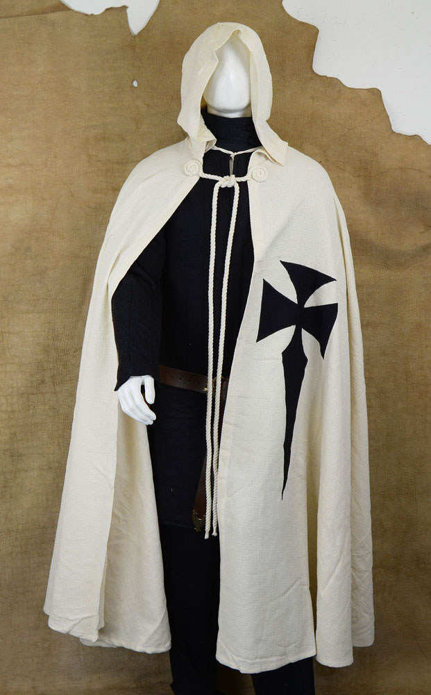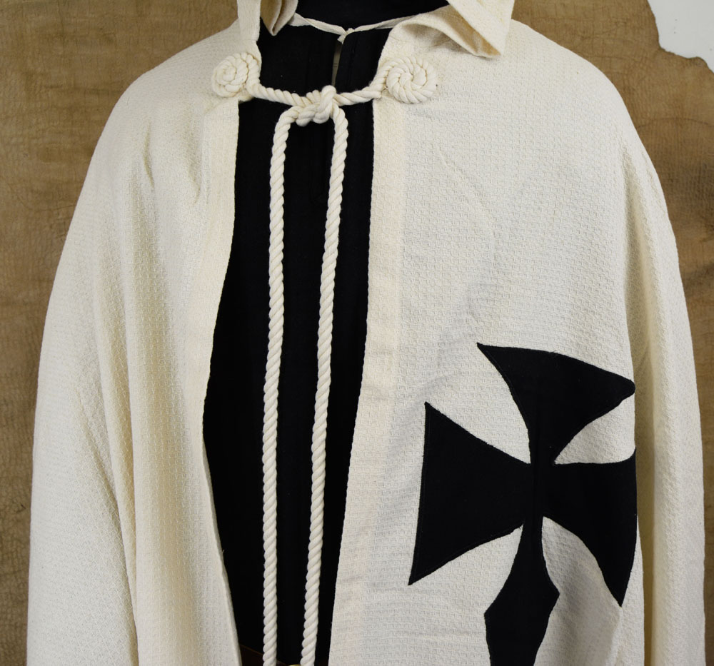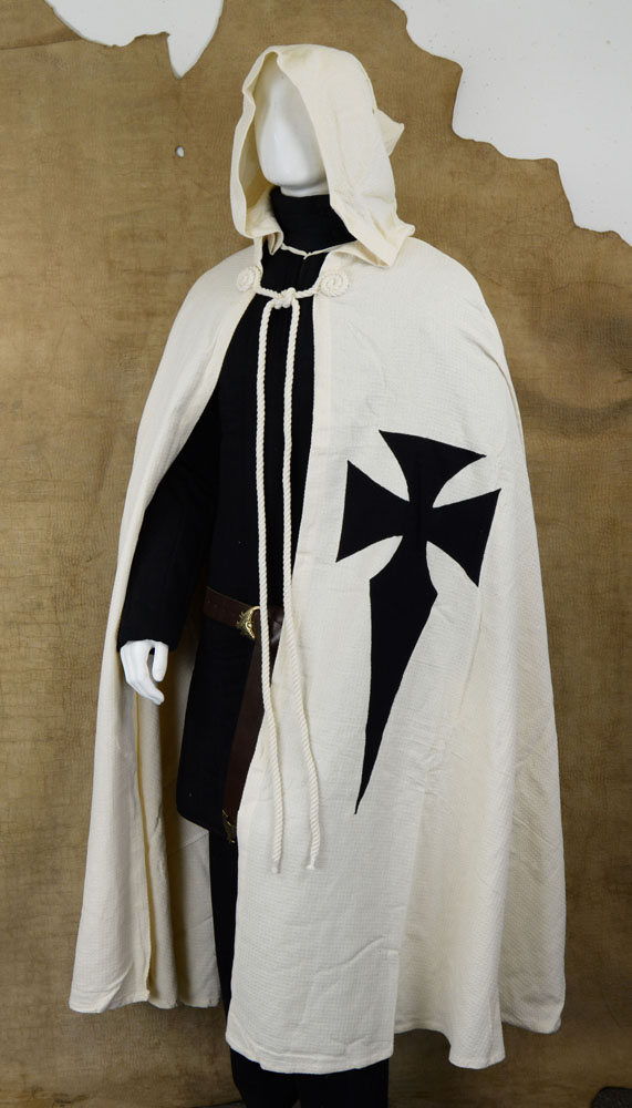 This Teutonic Knights Cape with hood is crafted from rough-woven cotton; the rough weave simulates the more handcrafted appearance of medieval period cloth. The cross is stitched to the cape for a more authentic construction. Two thick hanging cords allow it to be tied across the chest.