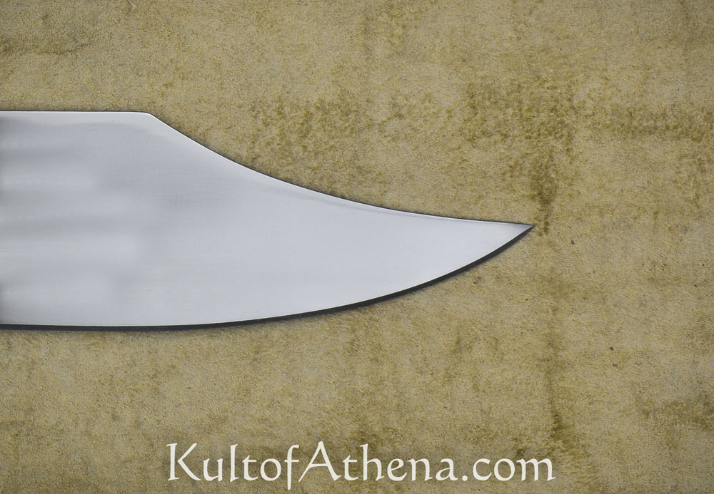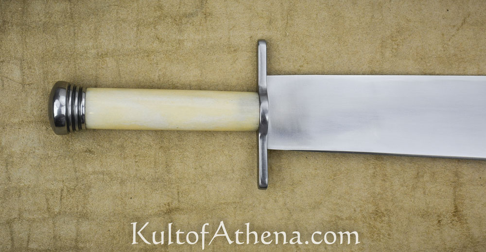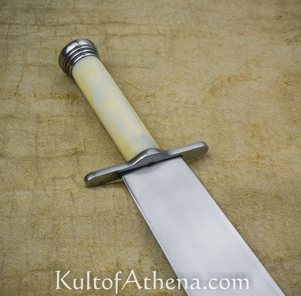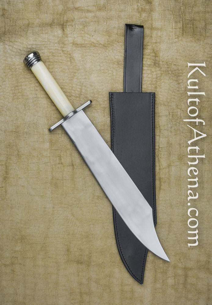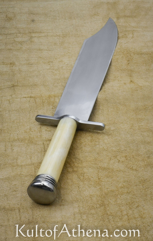 Effective, intimidating, and built to work! Lightweight, even for its imposing size, this was the knife to carry in a rough land like Texas during the days of Santa Ana when a man truly needed a backup weapon. Featuring an authentic bone handle, fittings of solid steel, and an high carbon steel blade. Based on an original design from a private collection. Includes a leather belt sheath.