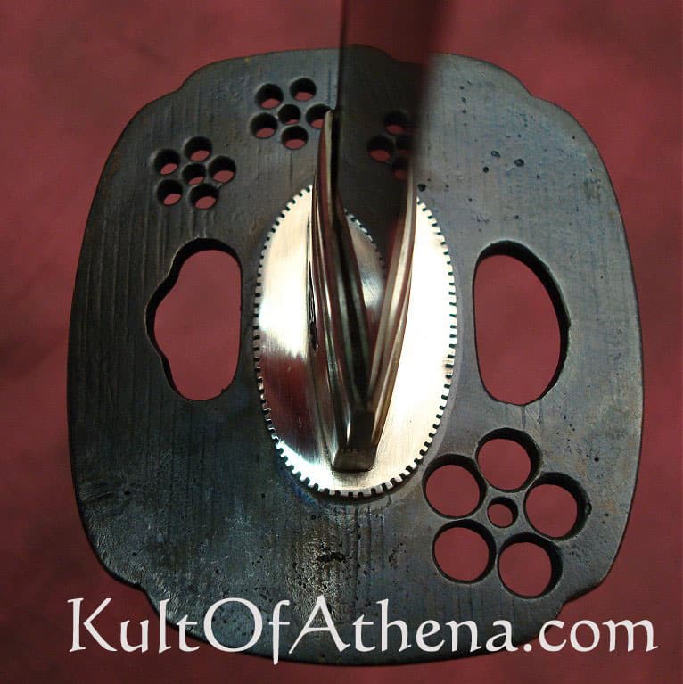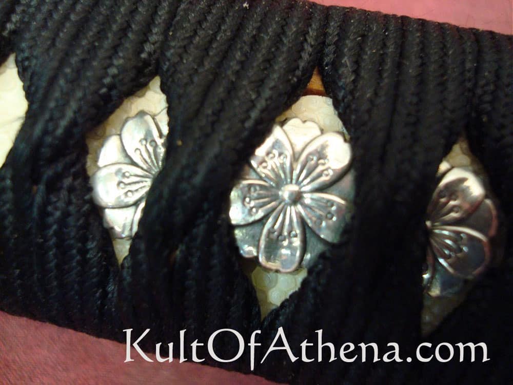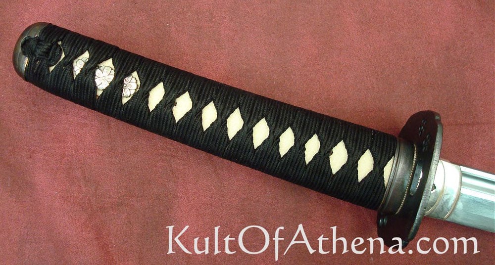 The Thaitsuki Isamashii Wakisashi features a Koto style, High Carbon forged steel blade with half Bo-Hi. The blade has been claytempered and polished to a finely sharpened edge. The grip is wrapped in a black silk cord over white ray skin and features silver Menuki. The habaki is also silver. The tsuba is made of brass in a blackened antique finish. Includes a black lacquered saya with buffalo horn Koiguchi.