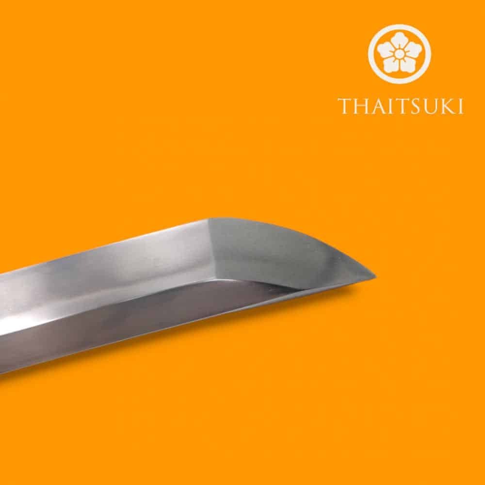 This Limited Edition Roiyaru Sanmai Katana has a Koto-style blade which was skillfully handforged in the traditional sanmai laminated construction method which melds panels of forge-folded high carbon steel together to form a composite blade with an inner core of shock absorbing steel of 35 Hrc for resilience and an exterior of hardened 65 Hrc steel to ensure it has excellent edge retention and resistance to wear. The blade edge and its side panels are formed from folded T8 high carbon steel and this has been melded with a core and spine of folded T10 high carbon steel. After the folding process of its components the blade possesses a total of 1024 individual layers. A closer look at the blade will reveal the ripple-like patterning of the folded steel, as well as a faint line denoting where the hardened edge steel was forge-welded into form. Visible among this is also the wave-like hamon line which was created when the blade was clay tempered in the traditional manner to imbue it with a genuine hamon of hardened steel. The blade was completed with a high level of polish which was painstakingly executed to give it a fine sheen which highlights the beauty of its complex construction and its hamon. The half-bohi blade has been heat-treated with the traditional clay-coating process and tempered to an edge hardness of 60 HRc, an outer body hardness of 45 HRc and an inner body hardness of 30-40 HRc. Its waved hamon from this process is clearly visible along the edge. The blade is finished by being hand polished and sharpened.