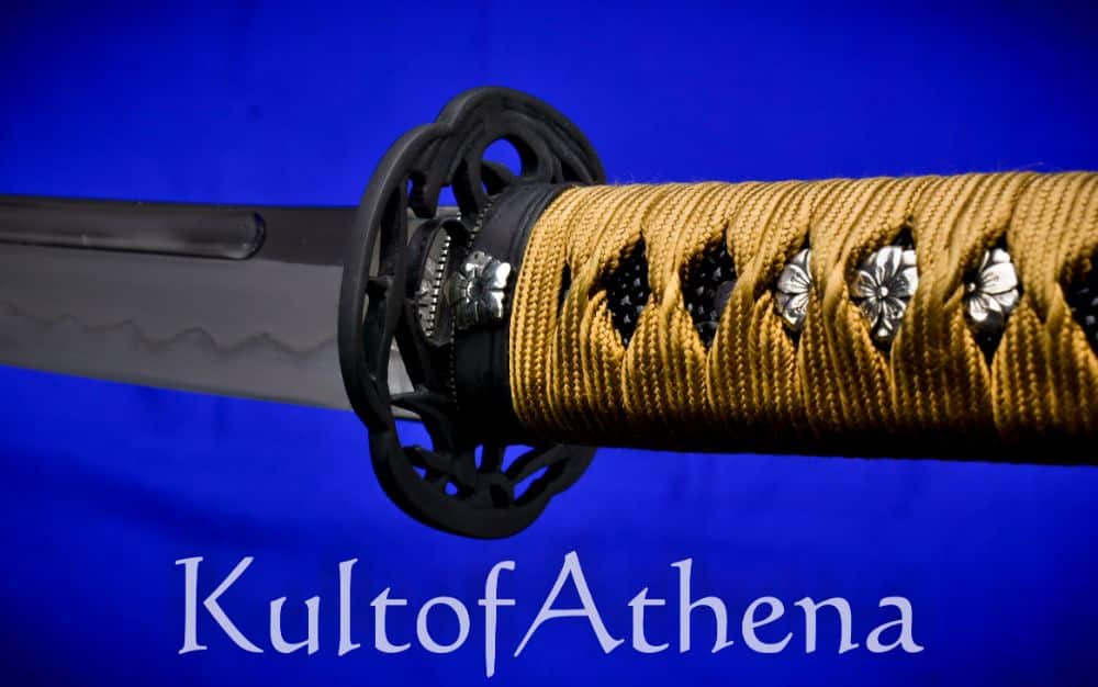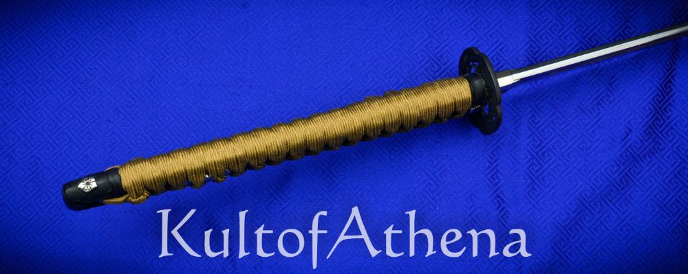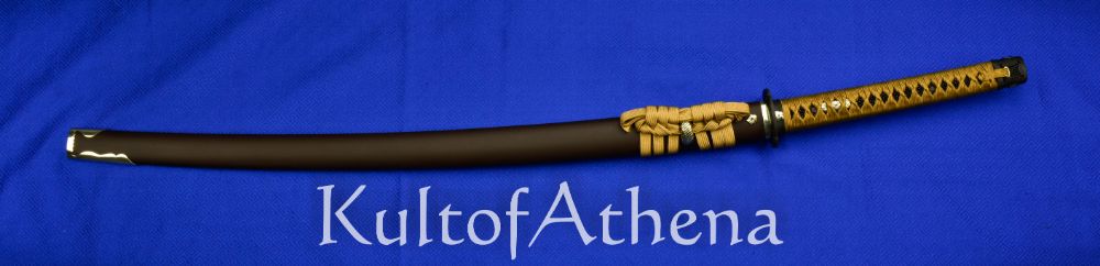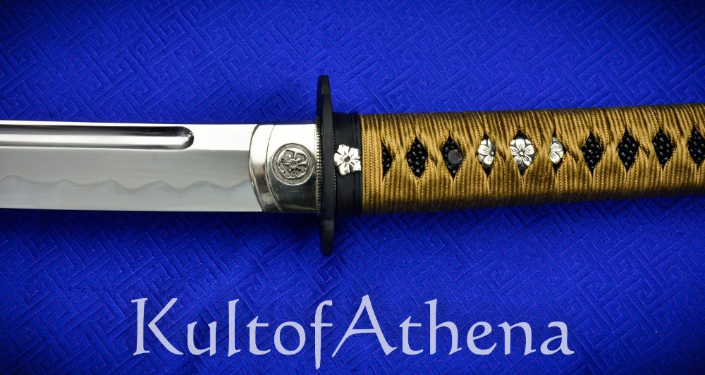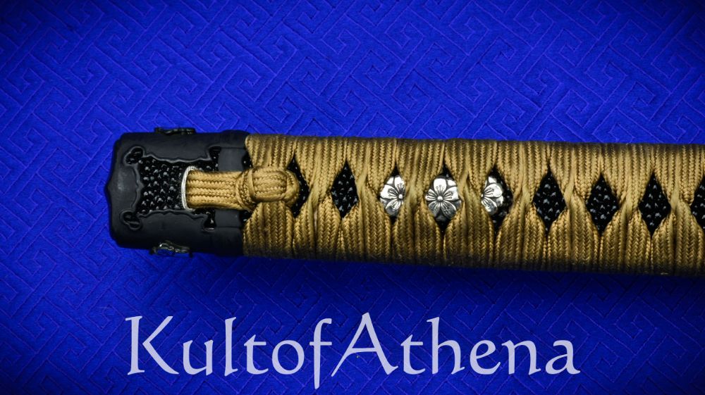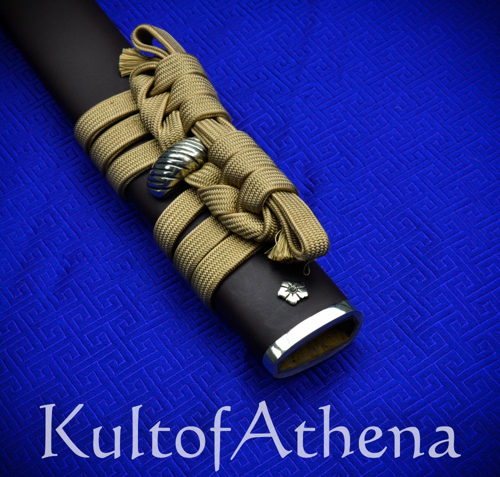 The sword is paired with a fine koshirae mounting to both match and dignify the blade with an elevated setting. The Habak and Seppa are of fine handcrafted silver and the fuchi, and kashira are of blackened and antiqued brass with silver accents. The highly detailed tsuba is of blackened and antiqued brass. The hardwood tsuka grip is inlaid with black lacquered rayskin of high quality and overlaid with tightly woven gold-brown imported Japanese silk tsuka-ito with fine silver flowered menuki beneath.