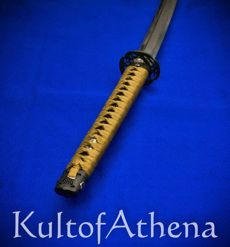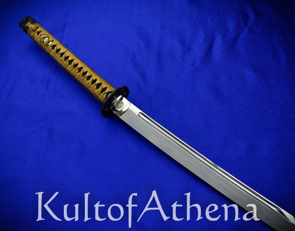 The Roiyaru Sanmai Katana has a Koto-style blade that was skillfully hand-forged in the traditional sanmai laminated construction method which melds panels of forge-folded high carbon steel together to form a composite blade with an inner core of shock absorbing steel of 35 Hrc for resilience and an exterior of hardened 65 Hrc steel to ensure it has excellent edge retention and resistance to wear. The blade edge and its side panels are formed from folded T8 high carbon steel and this has been melded with a core and spine of folded T10 high carbon steel. After the folding process of its components the blade possesses a total of 1024 individual layers. A closer look at the blade will reveal the ripple-like patterning of the folded steel, as well as a faint line denoting where the hardened edge steel was forge-welded into form. Visible among this is also the wave-like hamon line which was created when the blade was clay tempered in the traditional manner to imbue it with a genuine hamon of hardened steel. The blade was completed with a high level of polish which was painstakingly executed to give it a fine sheen which highlights the beauty of its complex construction and its hamon.