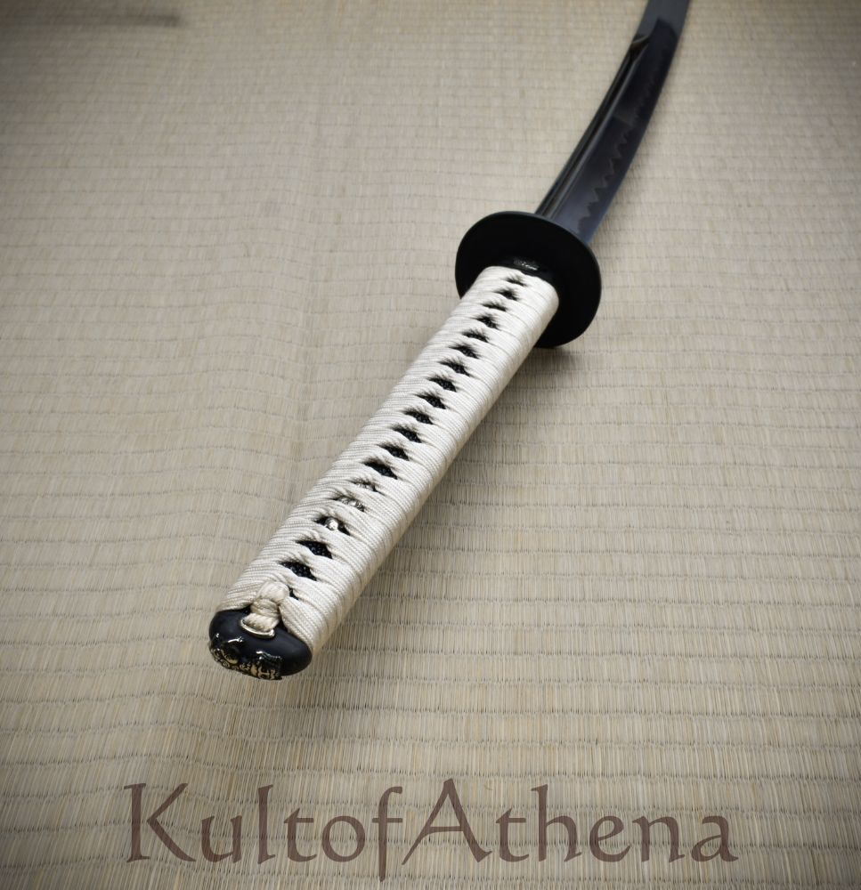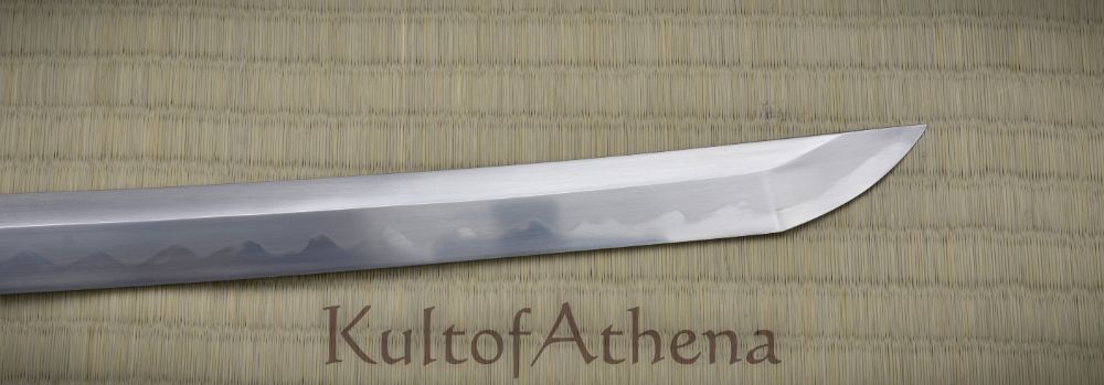 The Thaitsuki Sokueto Handachi Katana has a hand forged blade of T10 high carbon steel that has been well-crafted by a bladesmith of considerable skill. Its half-length bo-hi groove and thinned blade spine in the main striking portion of the sword creates a lighter and faster striking blade than many katana and this thinned spine minimizes drag as the blade passes through a target to optimize striking velocity for cleaner and more impactful cuts. The blade has been heat treated with the traditional clay-coated tempering method to impart an edge hardness of 60 HRc and a spine of 35 HRc. This imbues the blade with a softer core for flex and shock absorption and a hardened edge that will stay keen and resist wear and dulling. The wave-like hamon from this tempering is quite visible and vibrant and was brought out to its full beauty with a high quality hand-finished blade polish.