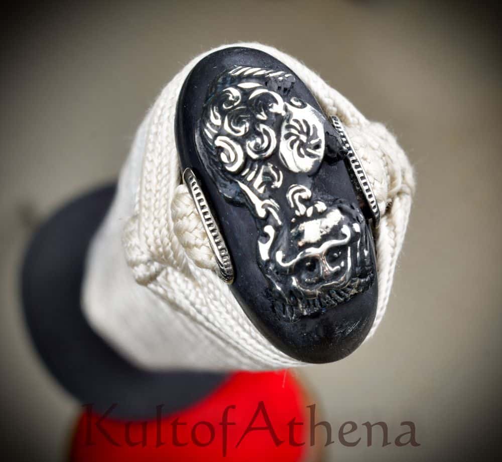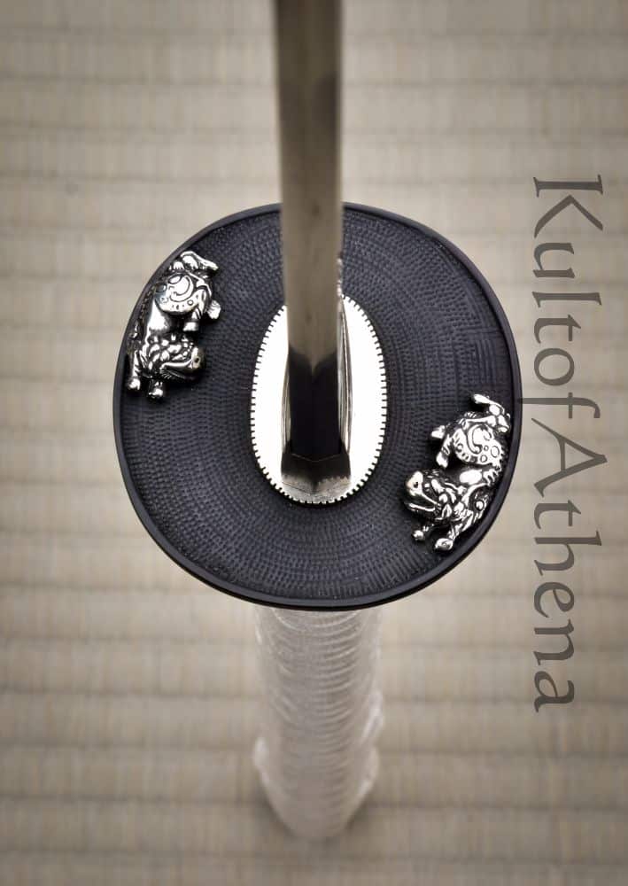 The tsuba, fuchi and kashira katana fittings are of blackened brass with is gorgeously embellished with highly dimensional Shishi Lion Dogs of silver. The habaki and seppa are likewise crafted from handmade silver to match. The fuchi and kashira hilt components are also of antiqued blackened brass with silver accents. The hardwood tsuka grip is inlaid with high quality black samegawa rayskin and overlaid with an well-knotted ito cord of imported Japanese silk. Two silver menuki lie beneath the knotted Ito grip wrap to complete the grip.