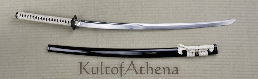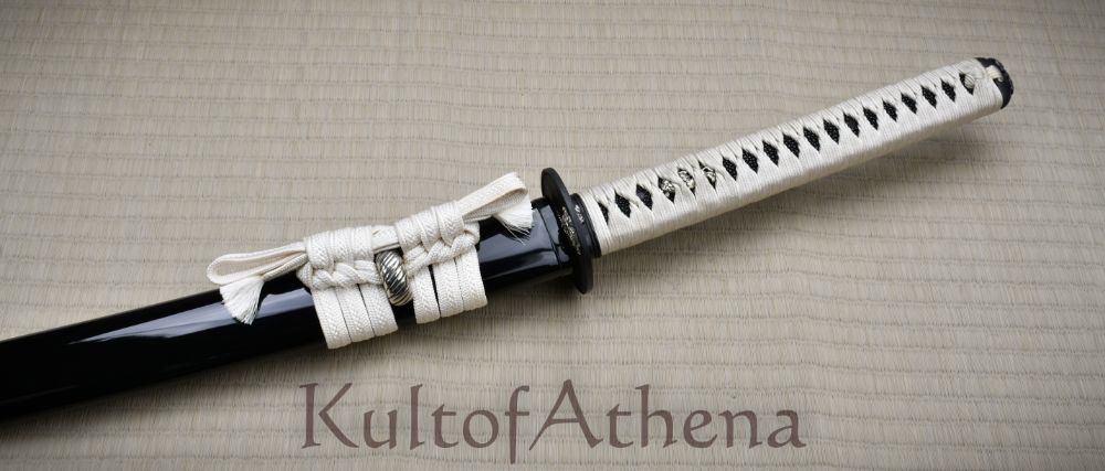 The well-carved wooden Saya scabbard has been coated with multiple layers of carefully applied glossy black lacquer and matched with smoothly polished koiguchi and kojiri fittings of buffalo horn and fetching kurigata of silver. It has a knotted sageo of white Japanese silk. The sword comes with a silk sword bag for storage and transport, as well as a signed manufacturer’s production certificate.