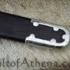 This reproduction has carefully recreated the fine detailing and precision designs of the original and expanded that motif to recreate the rest of the hilt. The blade is forged from high carbon steel which has been tempered. The hilt is sturdy and well-cast brass which has been plated to give it a silvered finish. Like the original find the pommel is a multi-part component which has been riveted together in its final construction.