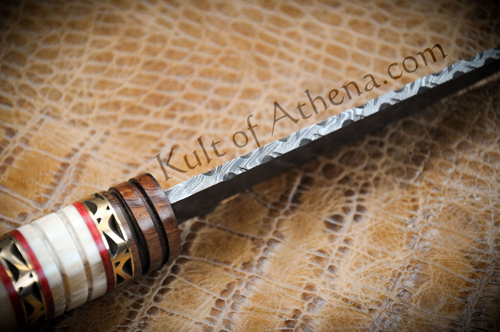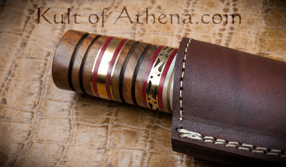 The Freeman has a blade boldly patterned in a form akin to burled wood due to its damascus steel blade. The two steels of differing hardness used to create the damascene blade can be clearly seen. The long grip is of finely polished wood, bone and brass. It comes with a sheath of stout stitched leather with a belt loop on its back.