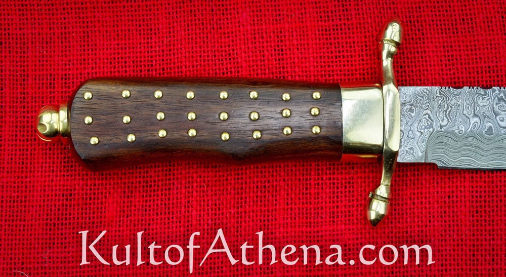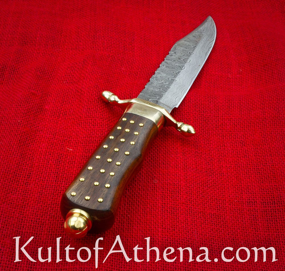 This ruggedly stylish fighting Bowie has a blade of Damascus steel and its many layers of folded steel give the blade a lively patterned design similar to polished burl wood. The blade was complete with carefully executed decorative filework along its spine. The guard and pommel nut are fashioned from brass and the polished wood grip is studded with brass pins. Included with the dagger is a robust sheath of stitched genuine leather complete with a belt loop and buttoned retaining strap.