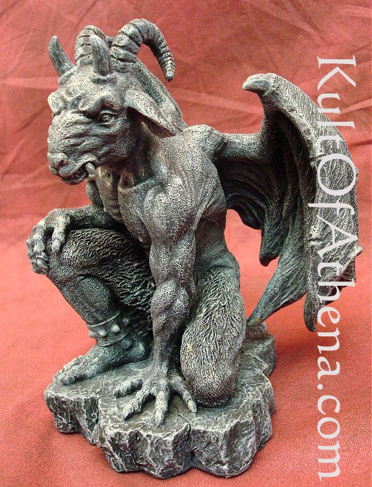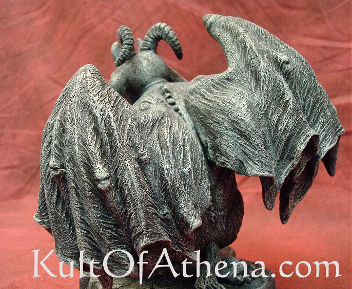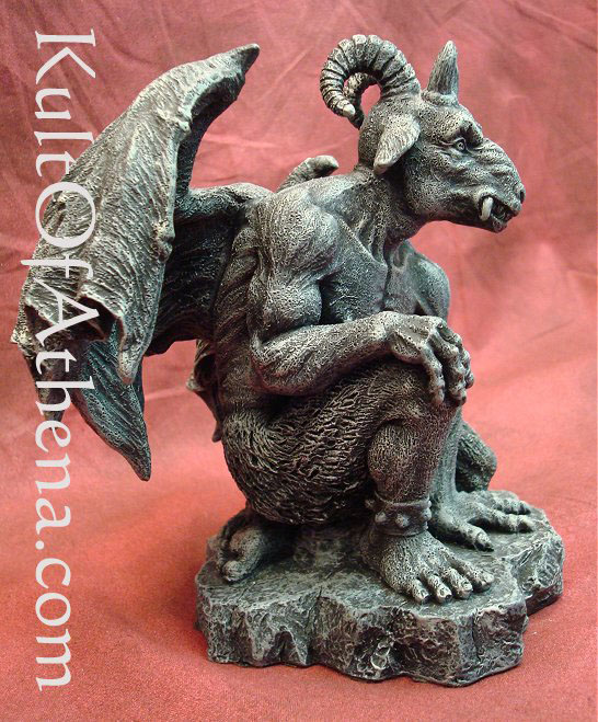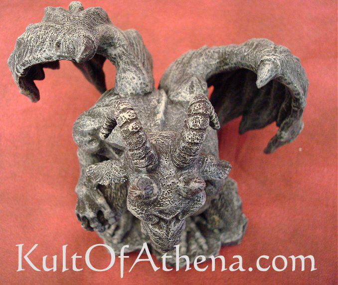 Cold cast in stone finished resin, this goat headed gargoyle looks quite imposing.
