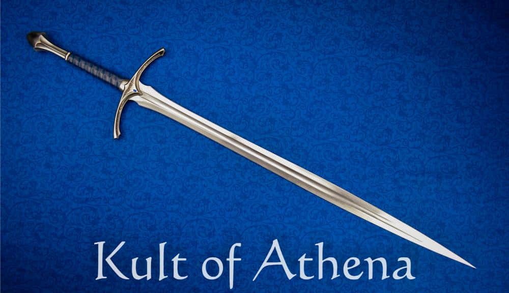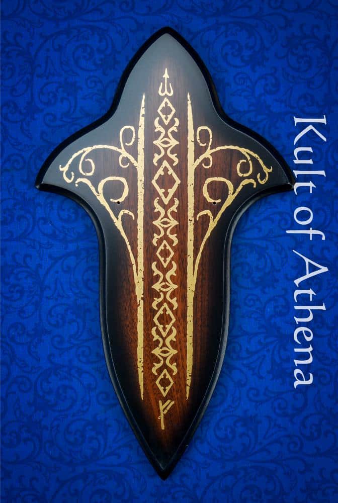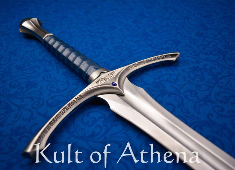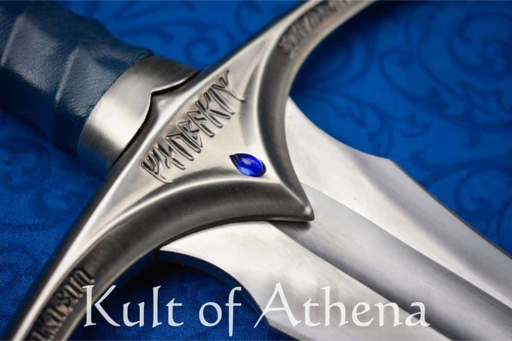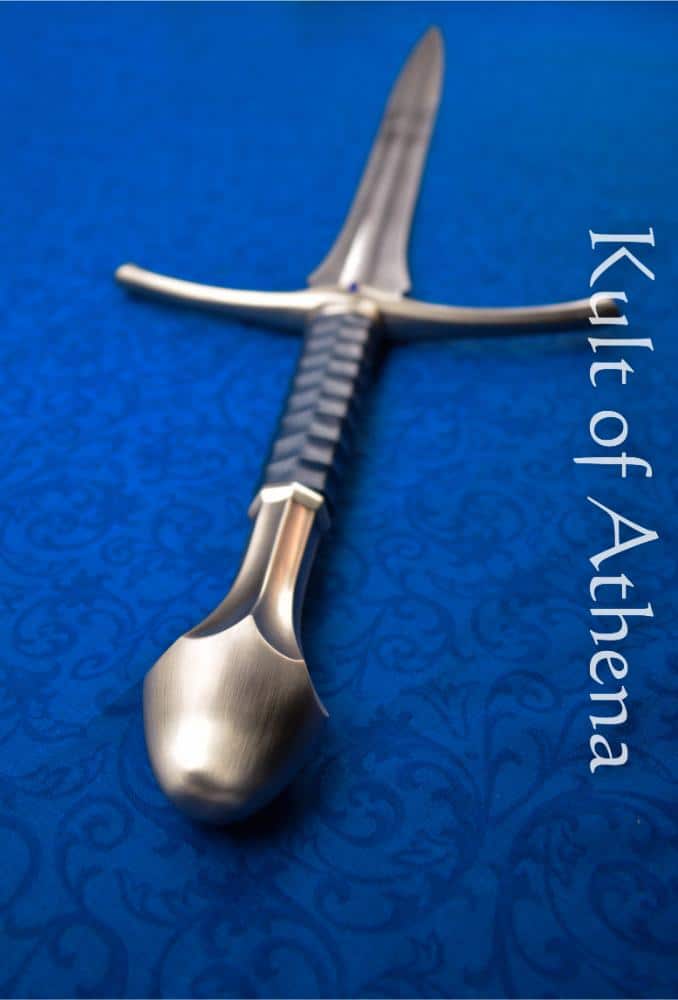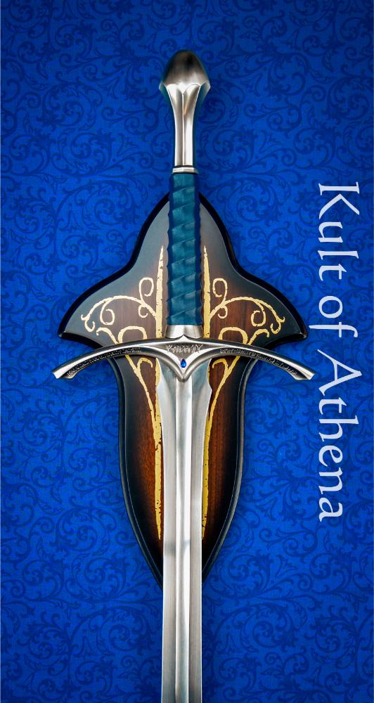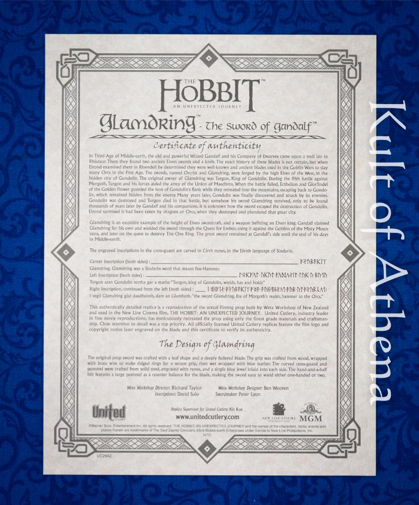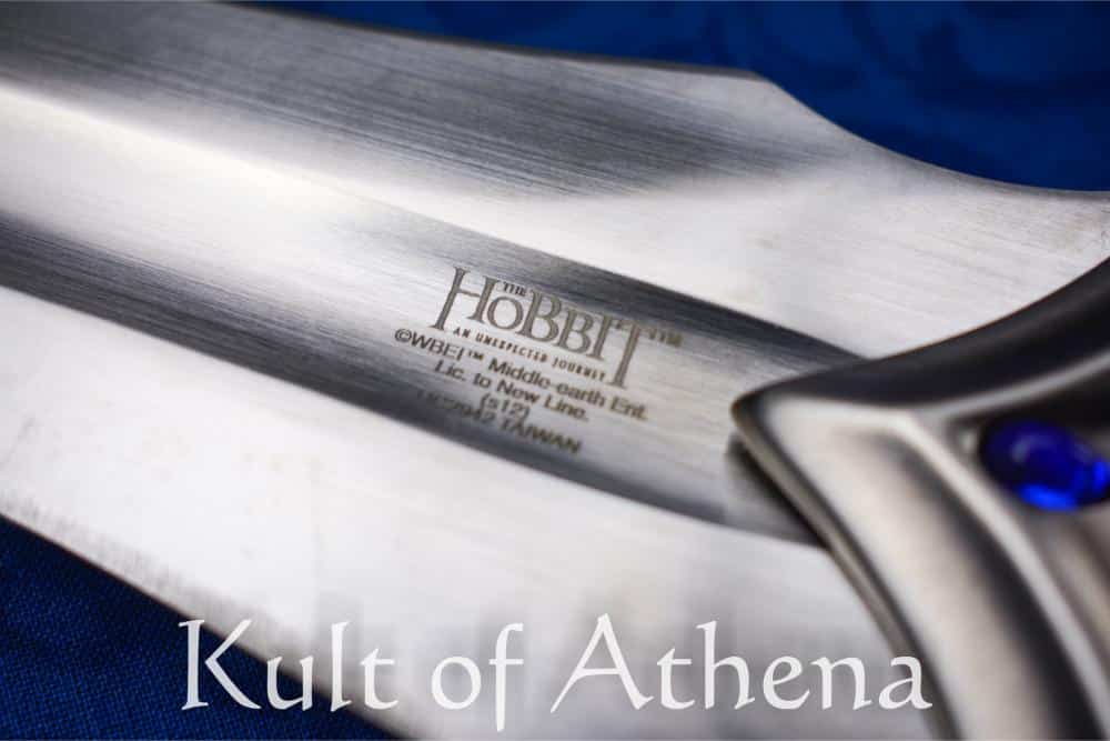 The reproduction by United Cutlery is crafted in stainless steel for easy maintenance. Blue stitched leather covers the handle. The deeply-fullered, leaf-shaped blade is blunted on the edges, though the tip itself is slightly sharp. It comes with a wall-mounting plaque adorned with Middle-Earth motifs and a certificate of authenticity.