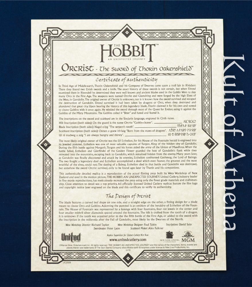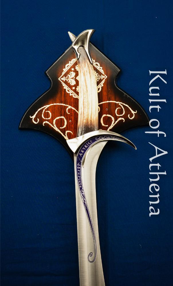 Once wielded in the First Age by the the elf Ecthelion of Gondolin, this elvish blade accomplished the legendary deed of slaying the baleful Gothmog, foremost of the Balrogs. Lost to time after Gondolin’s demise it was inauspiciously found by Thorin Oakenshield and the Company of Dwarves within a troll hoard ages later. Dubbed Orcrist meaning ”Goblin-Cleaver” in Sindarin, the blade has been the last sight of untold numbers of orcs and goblins who fearfully call the sword ”Biter”. Forged with the magic and craftsmanship of the elves of the West, the exquisite bladewould glow with pale blue light whenever goblinkind drew near.