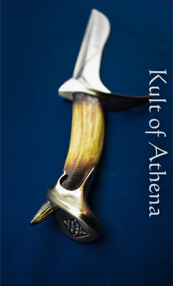 The pommel bears the heraldric seal of Ecthelion’s ”House of the Fountain” represented with four diamonds. The hilt was fashioned from a dragon’s tooth and the hilt and blade bears this runic inscription:
