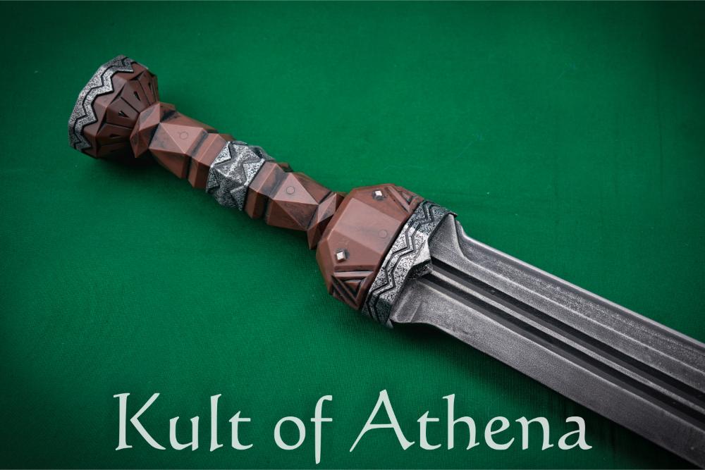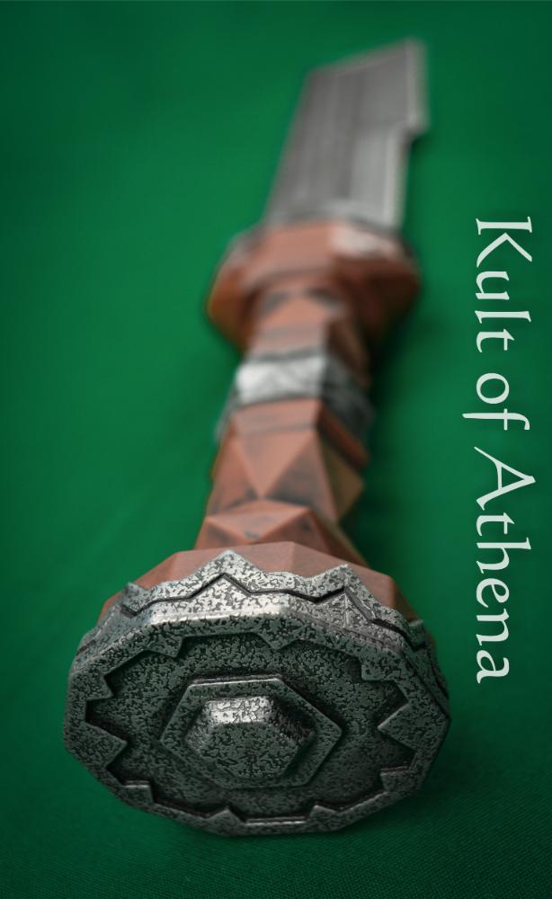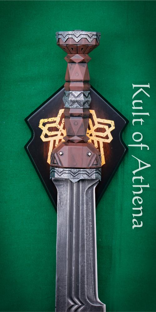 This replica of the Sword wielded by the dwarf Fili is a reproduction of the film prop used in The Hobbit. The blade is of AUS-6 stainless steel that has been antiqued for a battle-worn appearance. The fittings are of antique-finished steel and the handle is of hard acrylic. The sword comes with a wooden display plaque featuring a dwarven motif and a certificate of authenticity. Mounting hardware is included.