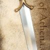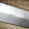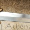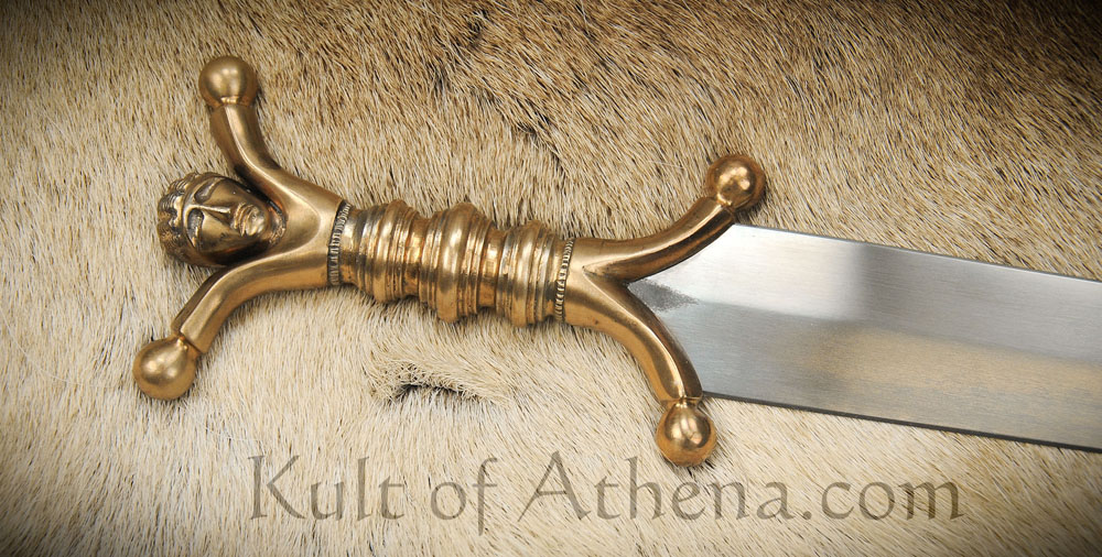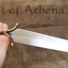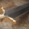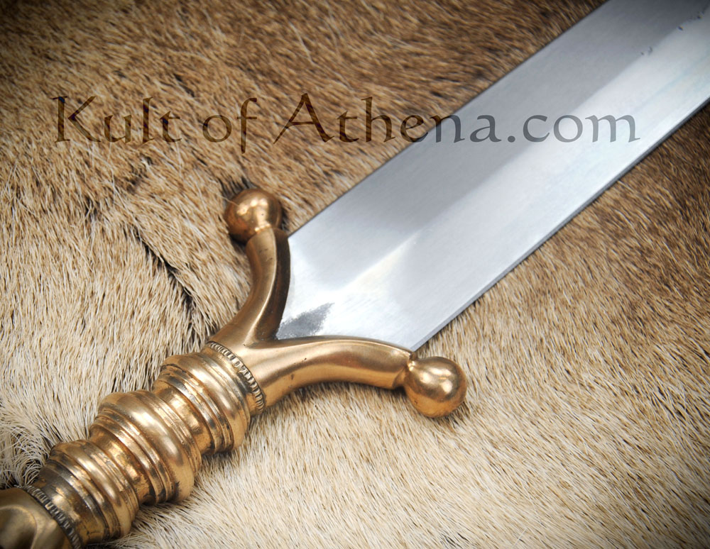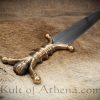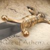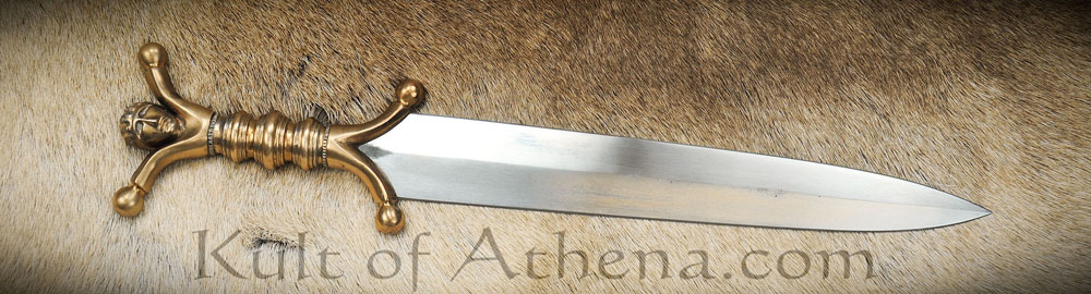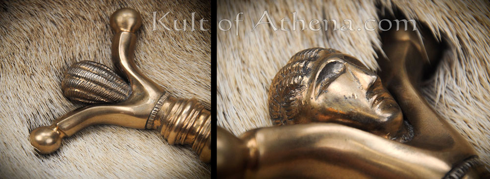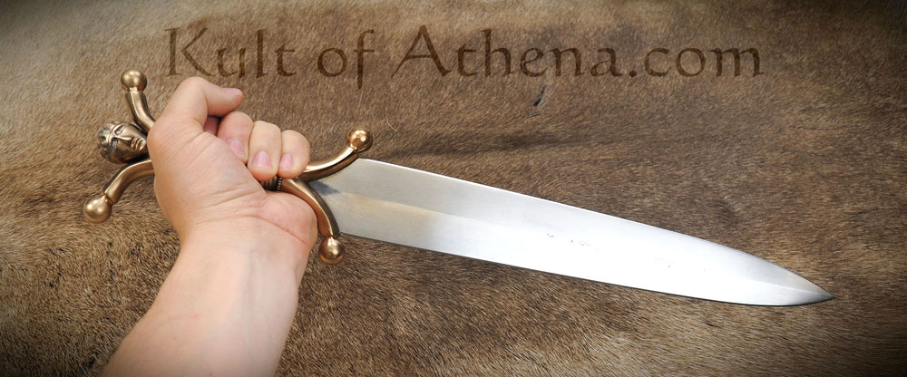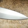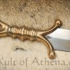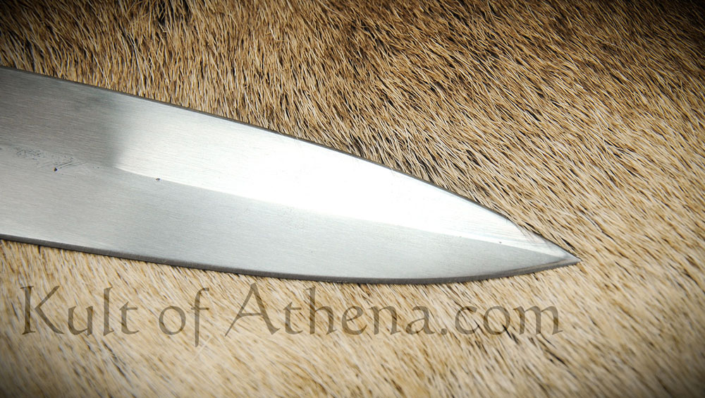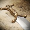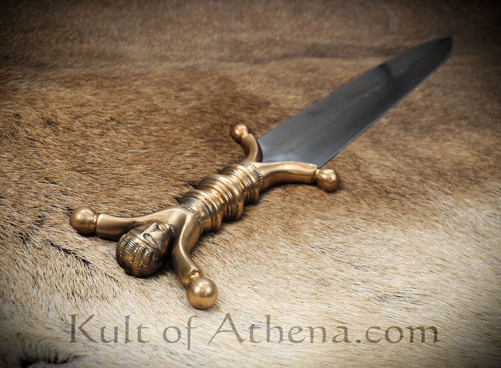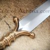 The dagger has a blade of tempered 14260 high carbon steel. The blade was intentionally forged with some small pitted marks and some rough-polished patches at the base to emphasize the handcrafted origin of the blade and to give it an essence of the Iron Age. The highly detailed hilt is cast from bronze.